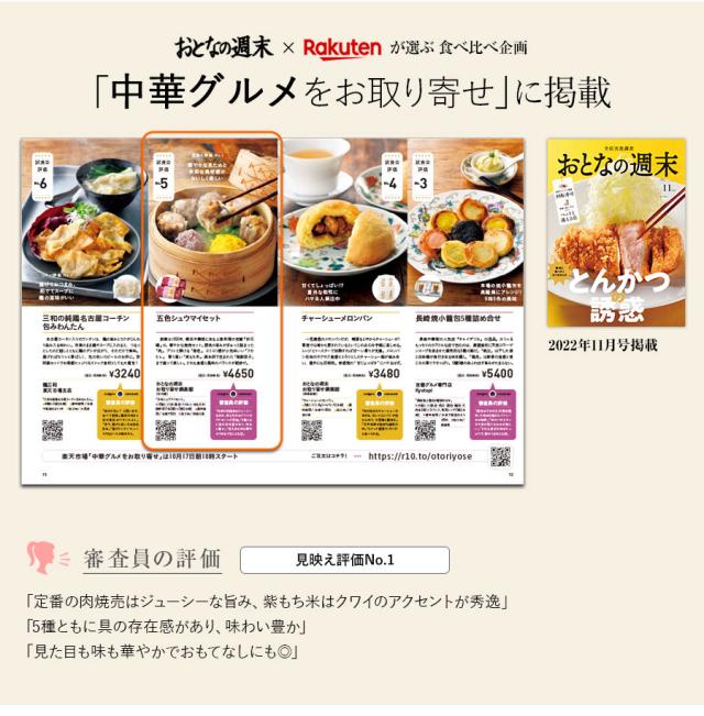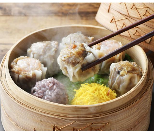 創業は1955年、横浜中華街にある上海料理の老舗『状元樓』の、華やかな焼売セット。豚肉の旨みがぎゅっと詰まった「肉」、プリッと弾ける「海老」、コリコリ感が小気味いい「フカヒレ」、香り高い「紫もち米」、錦糸卵で包まれた「海鮮団子」まで揃って楽しい。どれも食感と風味のバランスが絶妙だ。