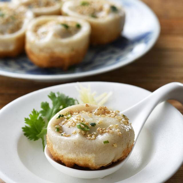 皮は一枚一枚手延べ、餡には北海道『なかしべつミルキーポーク』の自家製朝挽き肉と国産野菜を使う。上海で学んだ技を軸に手作りにこだわる一品は、カリッ、もっちり。生の豚皮を用いたスープの上品な旨みが炸裂する。専用の特製黒酢たれでどうぞ。