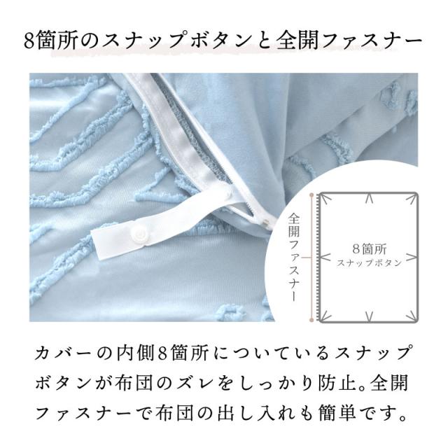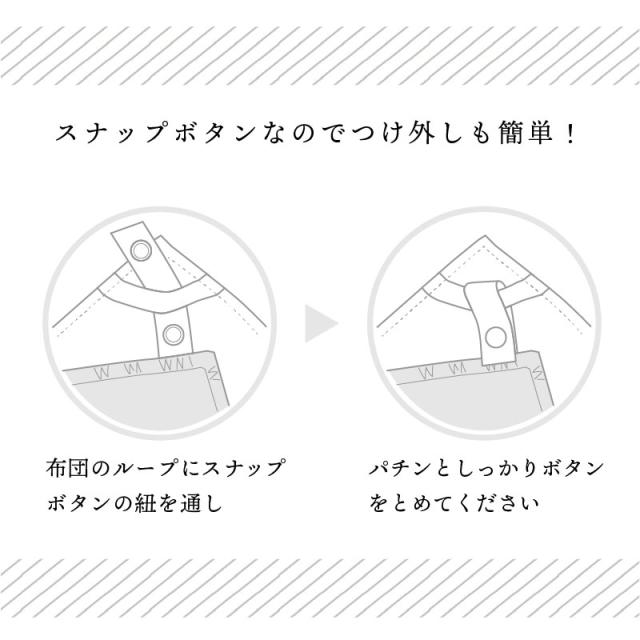 8箇所スナップボタン付きで掛布団がずれにくい!全開ファスナーで出し入れスムーズです。