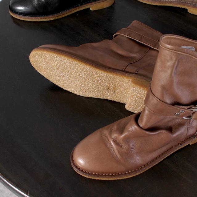 靴底には天然ゴムを焼き重ねたクレープソールを使用しています。硬い合成底とは違い、天然ゴム特有の弾力感で心地よいクッション性を発揮する、とってもコンフォータブルなソールです。歩く度に受ける足裏への衝撃も和らげてくれる特性があるので、疲れにくく、マイルドな歩き心地を叶えてくれます。