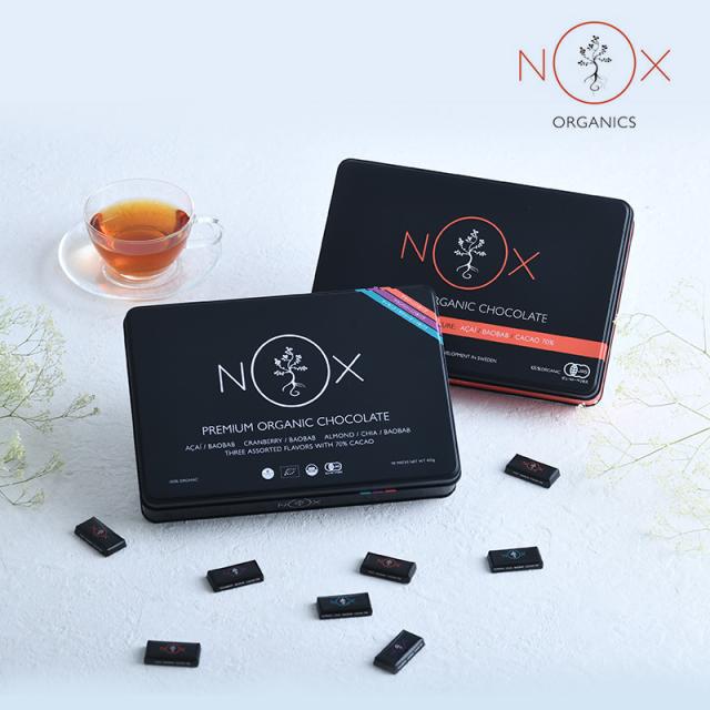 スウェーデンのMesopharma社(メソファーマ社)で開発された「NOXオーガニック」の商品。多くのチョコレートに含まれる上白糖や、トランス脂肪酸を含む植物油脂、香料や合成甘味料など、添加物を含まない100%オーガニックでナチュラルなチョコレートをお届けしています。