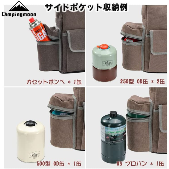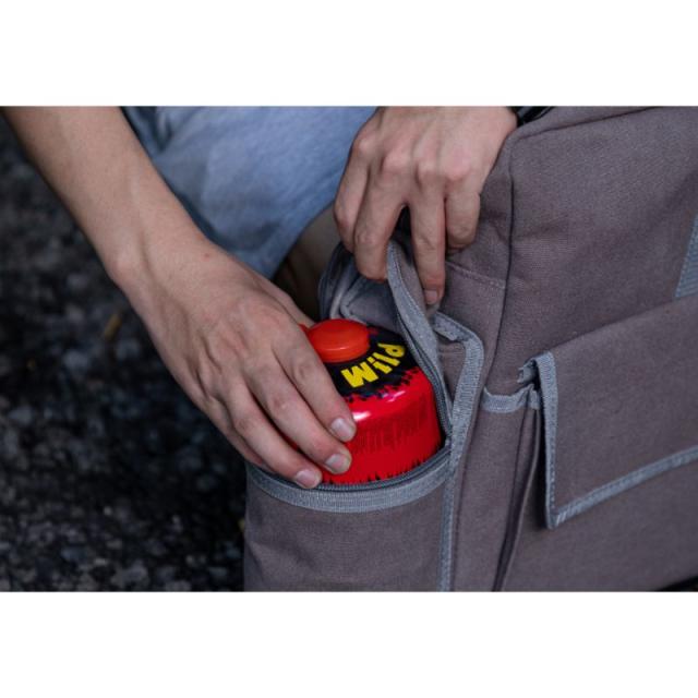 (3)各種小物やガス缶を収納できる大きめなフロントポケットとサイドポケット付