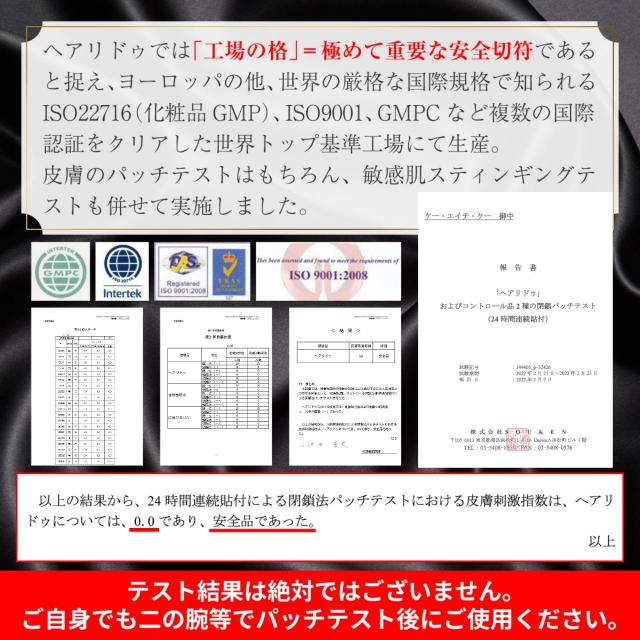 ・試験内容:「ヘアリドゥ」およびコントロール品2種の閉鎖パッチテスト(24時間連続貼付)