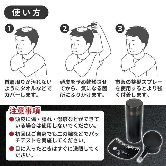 ■0.3〜0.5mmにカットされた天然素材の 増毛粉 が「静電気」により細毛や産毛、頭皮に吸着する事で髪を太らせ、