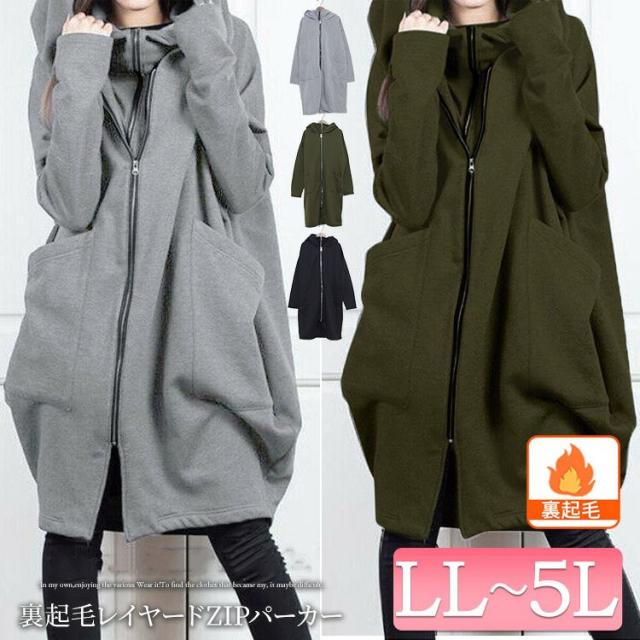 大きいサイズ レディース トップス パーカー 裏起毛 ロング 長袖 ジップ ポケット ロング 韓国 冬コーデ 冬 秋 新作 送料無料