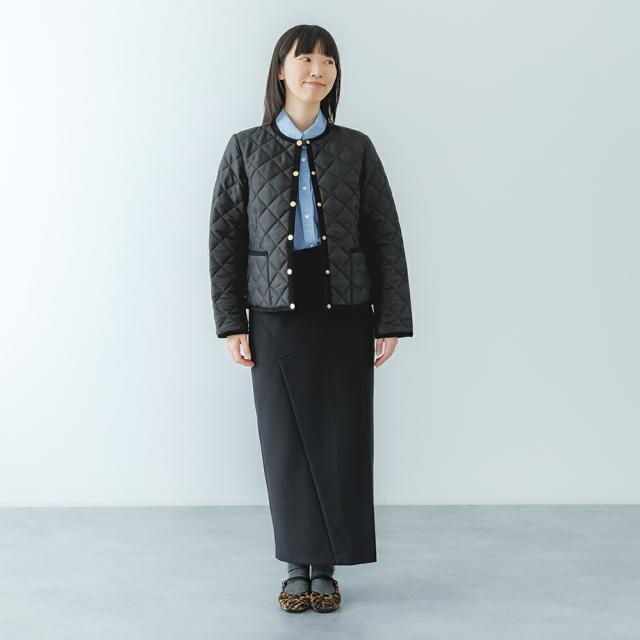 すっきりとしたノーカラーで、シャツやストール、タートルネックなど、幅広いコーディネートが楽しめます。 軽量で保温性に優れたキルティング素材