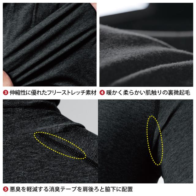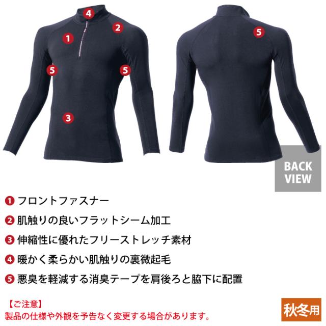 ◇機能:フロントファスナー・肌触りの良いフラットシーム加工・伸縮性に優れたフリーストレッチ素材・暖かく柔らかい肌触りの裏美起毛・悪臭を軽減する消臭テープを肩後ろと脇下に配置