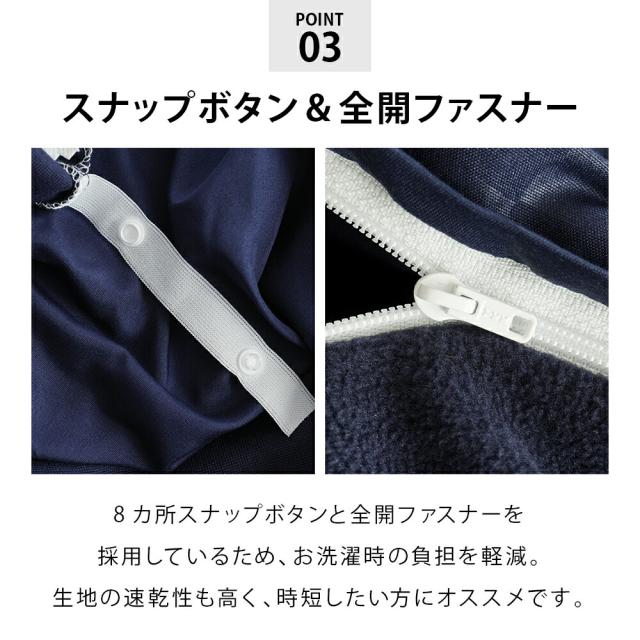 ・フリース素材 長所:軽くてあたたかく、速乾性もあるので冬のファブリックとして人気の素材です。発色性もよく、様々なデザインを施せます。/短所:静電気や毛玉がやや多いのが難点です。 ・8ヶ所スナップボタン付き内側8ヶ所のヒモはボタンを留めるだけなので装着が簡単! ・全開ファスナーサイドのファスナーが大きく全開するからお布団が出し入れしやすい! |