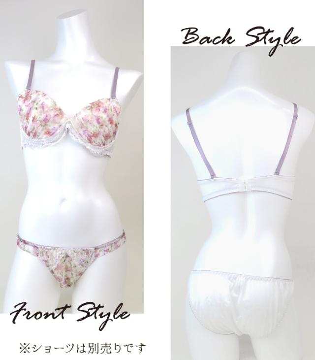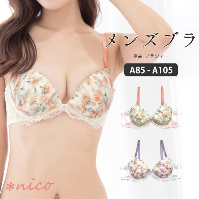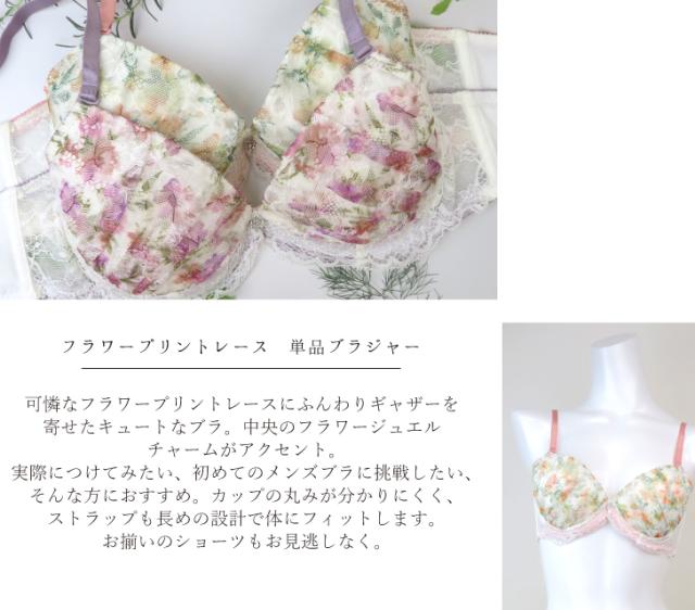 可憐なフラワープリントレースにふんわりギャザーを寄せたキュートなブラ。中央のフラワージュエルチャームがアクセント。実際につけてみたい、初めてのメンズブラに挑戦したい、そんな方におすすめ。カップの丸みが分かりにくく、ストラップも長めの設計で体にフィットします。お揃いのショーツもお見逃しなく。