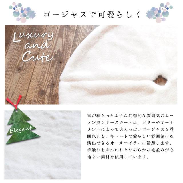 雪が積もったような幻想的な雰囲気のムートン風ツリースカートは、ツリーやオーナメントによって大人っぽいゴージャスな雰囲気にも、キュートで愛らしい雰囲気にも演出できるオールマイティに活躍します。手触りもふんわりとなめらかな毛並みの素材を使用しています。