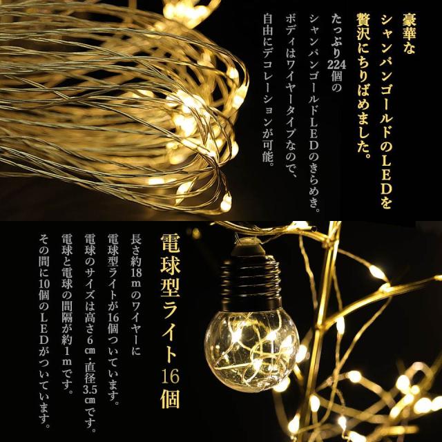 クリスマス ツリー 飾り LED イルミネーションライト ワイヤーイルミネーション 18m (G40 電球16球/224LED) 電球色3000K[880063]