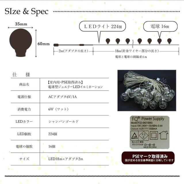 ★ジュエリーLED電球型イルミネーションライト シャンパンゴールド(電球色)18mコンセント式 アレンジ自由自在なワイヤーLEDストリングライト。長さ約18mのワイヤーにシャンパンゴールド(電球色)LEDが224個もついています。電球型ライトは、約1m間隔で16個ついています。 ワイヤーの長さが18mのロングサイズなので、180cmの大きなツリーの電飾としてお使いいただいてもピッタリです。また、ボリュームがあるので、お部屋のインテリアとして直接に床に置いて間接照明としてお使いいただいたり、天井から吊るせば星のように美しくきらめく空間を演出します。 [PSEマーク取得製品] 電気用品安全法(PSEマーク)は、100Vコンセントに接続して使用する電気製品を対象にした安全規格です。国が定める、安全基準の検査に合格した電気製品に表示されています。特定電気用品は、高危険度が予測されるため、厳重に審査された電気用品となります。本製品は、「特定電気用品」になります。 |
