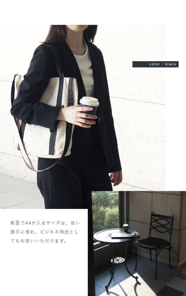 A4サイズの書類や、PCもすっぽりと入るので、通勤や通学のサブバッグにもおすすめです。