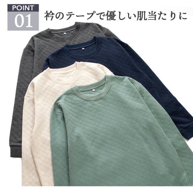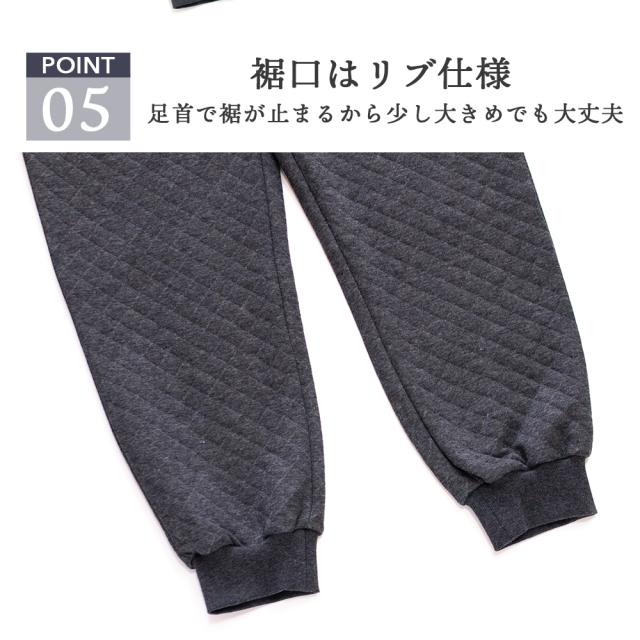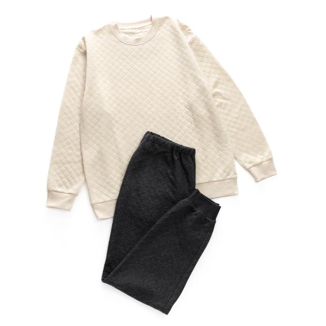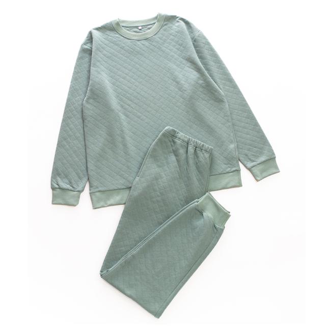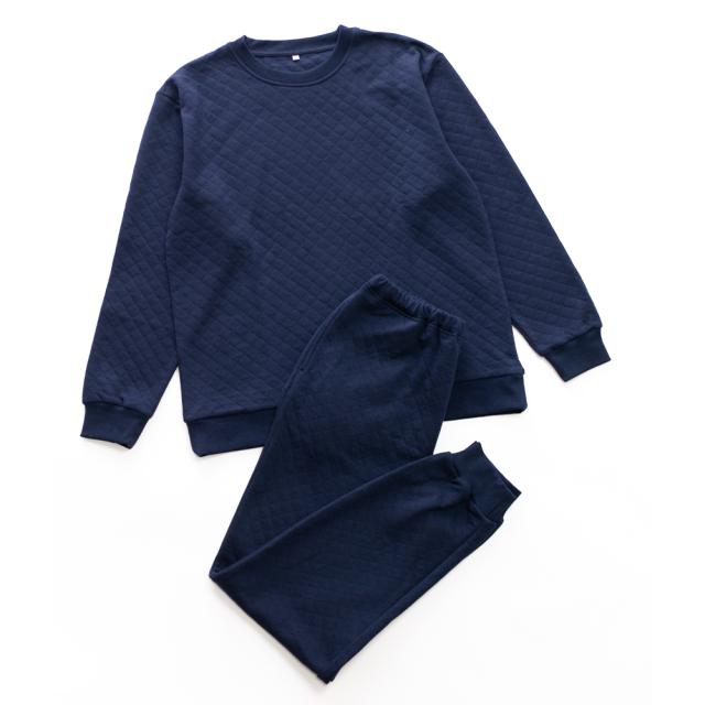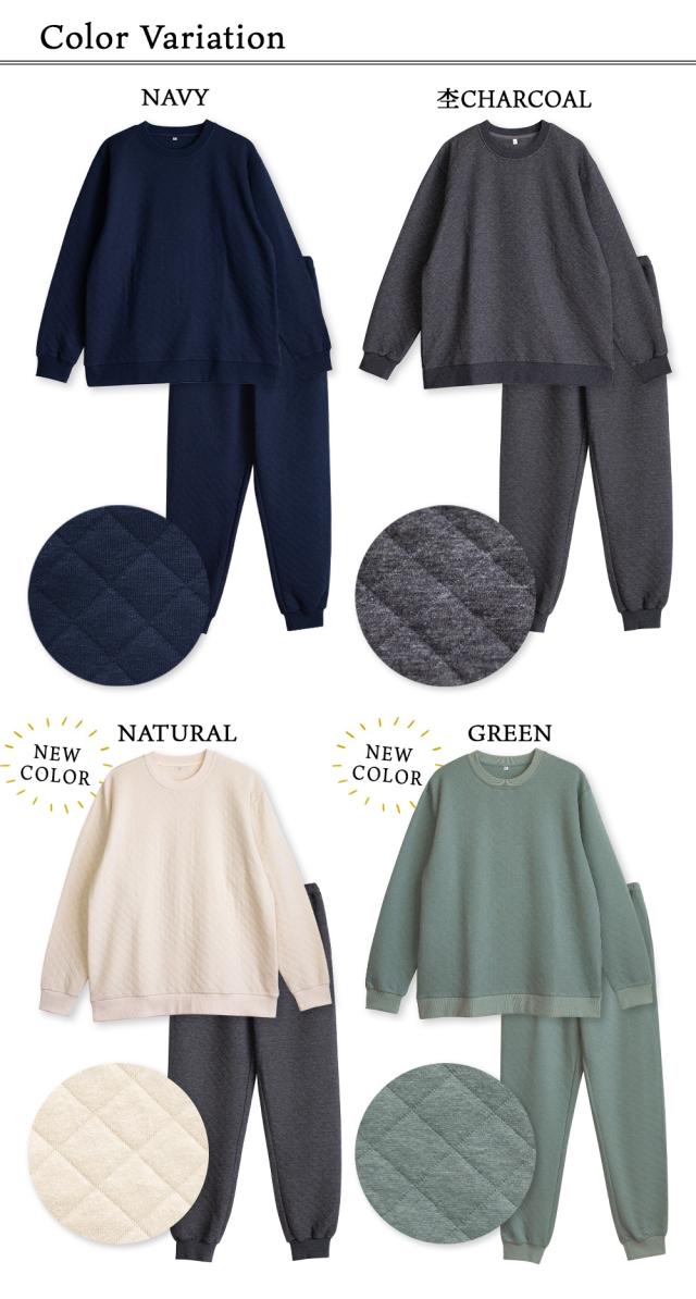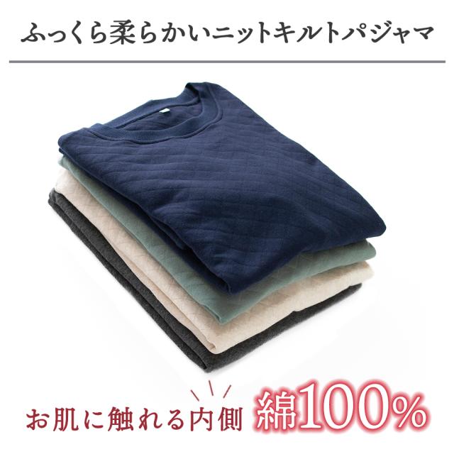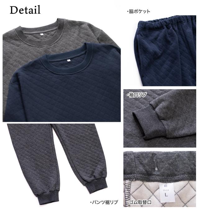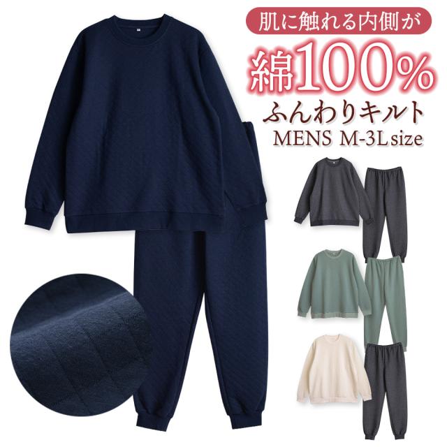 パジャマ メンズ 内側が綿100% 長袖 冬 ふんわり柔らかなニットキルト ダイヤキルト セットアップ スウェット上下 リブ仕様 ネイビー ナチュラル グリーン 杢チャコール M L LL 3L 親子 おそろい 58244