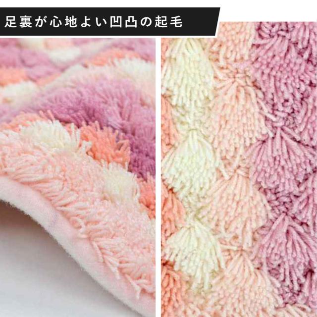 毛足の先がカットされたものと、ループ状になっている毛足の2種類からできており、毛足の長短によりポコポコとしたテクスチャをつくりました。このデコボコが足裏に気持よくお風呂上がりをより快適にしてくれます。