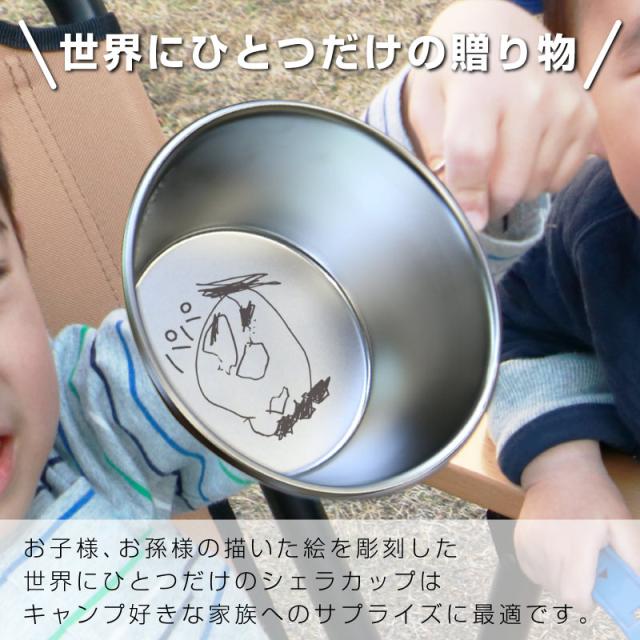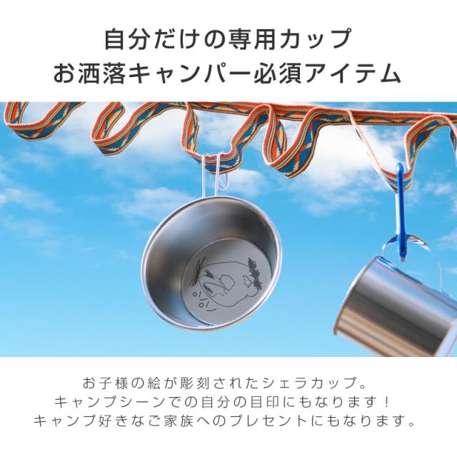 \ ギフトならオリジナルがうれしい / キャンパーも納得のステンレスシェラカップにお子様の書いた絵を彫刻。さらにオリジナル収納袋付きで持ち運びも便利!