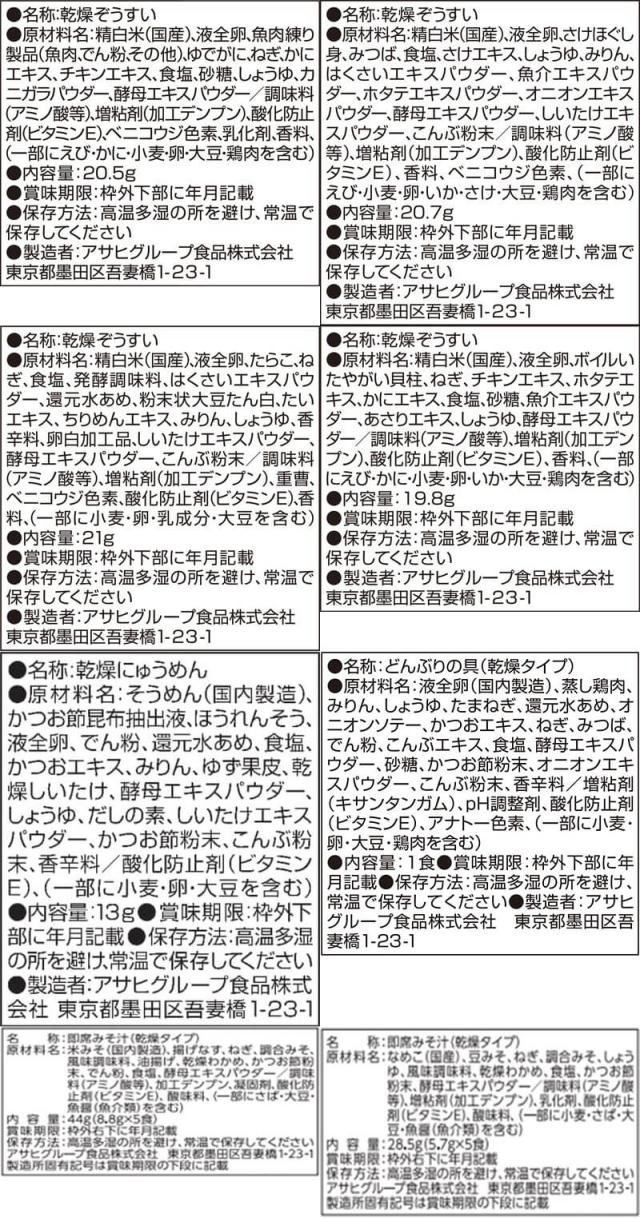 | 内容量 | ■ 雑炊 ほぐし身入り かに雑炊 20.5g ほぐし身入り さけ雑炊 20.7g 炙り たらこ雑炊 21g まるごと 貝柱雑炊 19.8g ■ にゅうめん すまし柚子 13g ■ 丼の具 とろっと卵の親子丼の具 22.5g 各2食 ■ うちのおみそ汁 5食入 なすとお揚げ 44g なめことわかめ(赤だし) 36.4g 各2袋 8種 32食 |