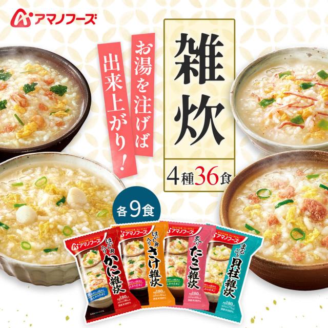 アマノフーズ フリーズドライ 雑炊 4種36食 詰め合わせ セット 【 送料無料 沖縄以外】 インスタント食品 海鮮 ぞうすい 国産米 かに さけ たらこ 貝柱 魚介だし 常温保存 即席 ご飯 和食 低カロリー 備蓄 ホワイトデー 2026 母の日 お返し