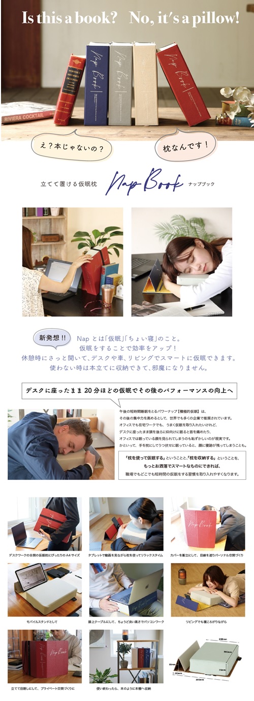 | 商品説明 | ・仕事や勉強の合間や昼食後などの休憩時に、ちょっと仮眠してみたものの逆に体勢が悪くて辛くなった経験はありませんか? ・さっと取り出して気持ちよく仮眠するための枕で、しっかり短時間睡眠をしてその後のパフォーマンスを向上。 ・本のように立てて収納できるので、使いたい時にさっと取り出せ、使用後も置き場に困らず仮眠をスマートに習慣化しやすくなります。 ・カバーの中にはふっくら柔らかい低反発の枕がセットされており、取り外しも自由。そのまま使ってもいいし、カバーを外して衝立てにすることで寝顔を隠せて落ち着いて仮眠ができます。 ・気持ちよい柔らかさのクッションと肌触りで顔に寝跡がつく心配はありません。クッションカバーは汚れたら取り外して手洗いできます。枕本体は日陰干ししてください。 ・カバーを内側に三角に折畳んで固定すれば、モバイルスタンドにもなります。 ・枕として使用する以外に、閉じた状態で膝上簡易テーブルとしてもちょうどよい大きさで便利です。13インチ程度までのパソコンを使うのに最適です。 |
