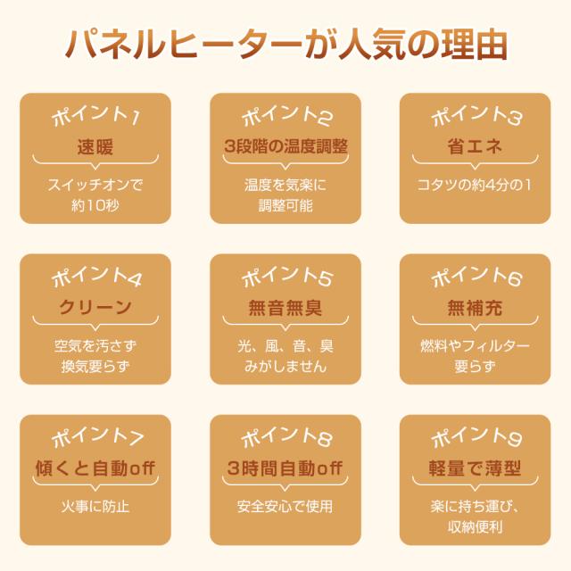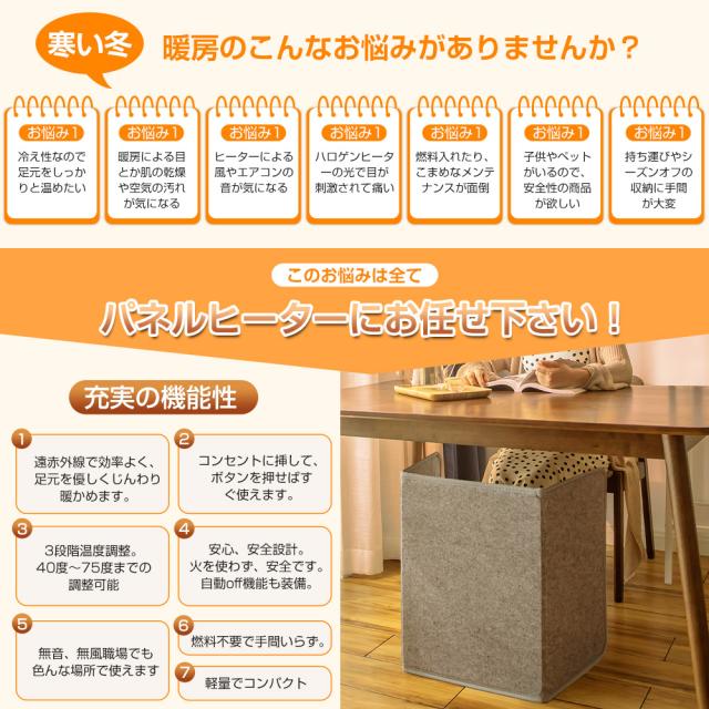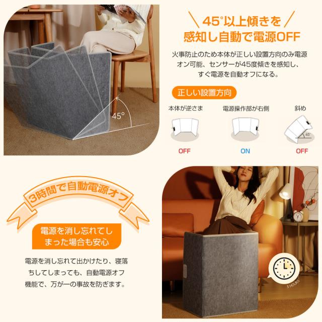 【職場も大活躍&3時間自動電源オフ】エアコンを使っていますが常に足元が寒いと感じて仕事を集中できない経験がありますか?足裏は体中の血管が通るところなので、ここを温めれば身体中が温まります。デスクワークや勉強の時にこのパネルヒーターを使うと頭がボーッとすることもなく集中できます。3時間で自動電源オフ機能があり、職場で消し忘れも防止できます。無音のデザインも安心して使えます。