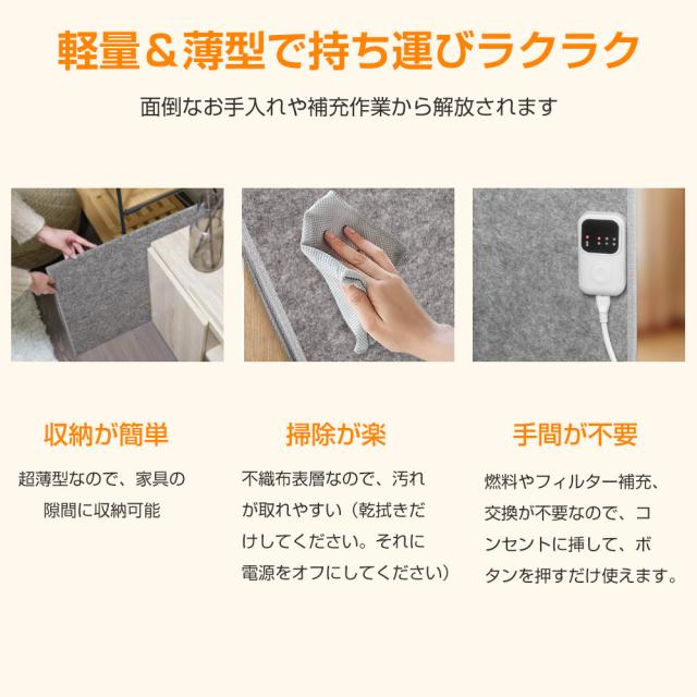 【収納便利&半年間保証】折りたたみ可能な設計、使わない時は隙間に収納できる程度に薄くなります。移動も設置も楽です。弊社から購入されたパネルヒーターは、ご購入日から半年間の保証期間があります。万が一、何か不具合や不満がありましたら、ご連絡いただければ幸いです。ぜひ24時間以内に対応できます。