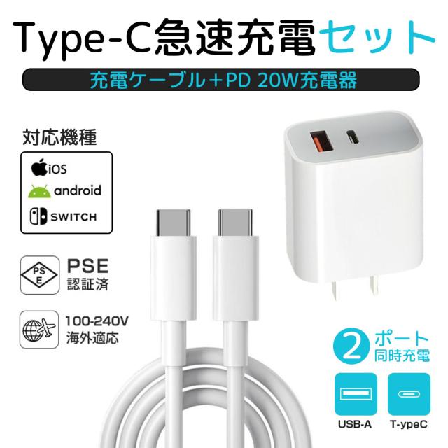 【iPhone15-17シリーズ対応】 20W PDアダプター 2ポート + USB-Cケーブル 2点セット 充電コード 急速充電 データ転送 PSE認証 iPhone17 iPhone Air iPhone16 iPhone15 Android Switch 充電器 充電ケーブル タイプC TypeC USB-C