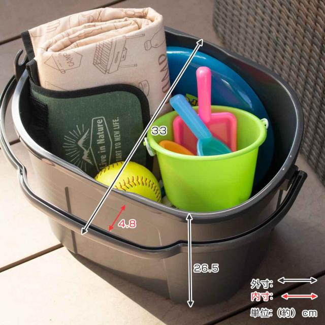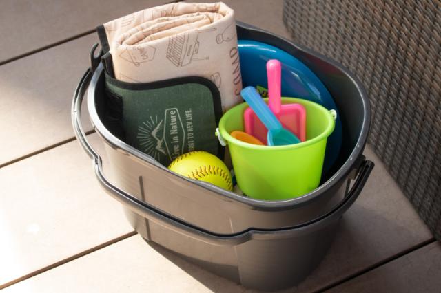 外遊び用の小物入れとしてひとまとめにしておけば、いつでもサッとお出かけができます。また、楕円形の形状が靴洗いに最適で、深さがあるのでお庭の土を混ぜ合わせたりなど、ガーデン用品としても便利にお使いいただけます。