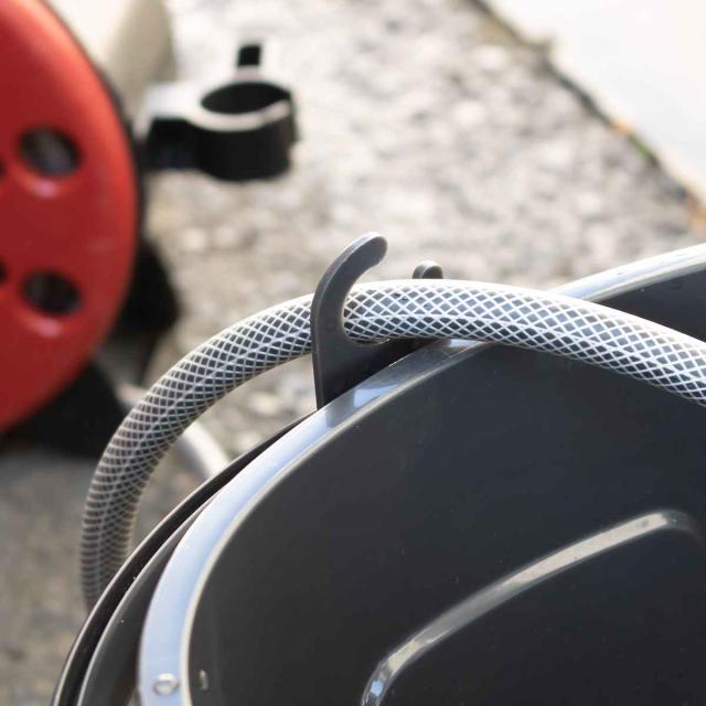 取っ手部分の片方にはホース止めが付いています。ホースをずっと持っていなくても固定できるので水の入水時に便利です。