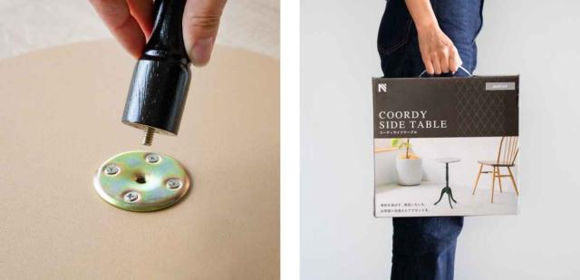 | 工具不要の簡単組み立て ネジ式になっているので、支柱と脚を天板にねじ込むだけの簡単組み立てです。 | パッケージ 手持ち付きのコンパクトなパッケージに入っています。 |