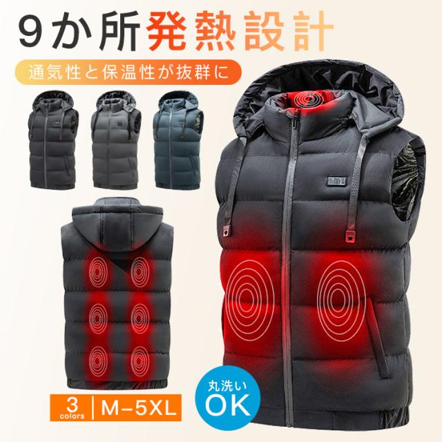 電熱ベスト 9か所発熱 3段温度調整 丸洗いOK発熱服 ジャケット 秋冬用 防寒ベスト バッテリー給電 ヒートベスト 軽量 スキー ヒーターベスト スケート登山 釣り