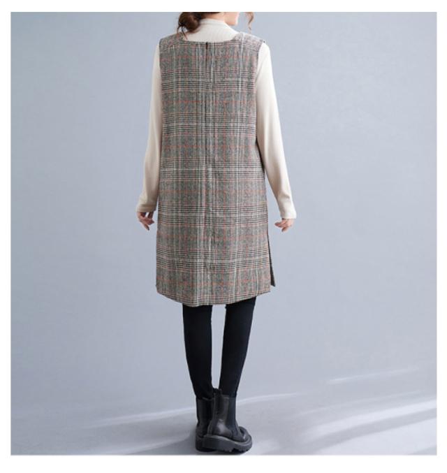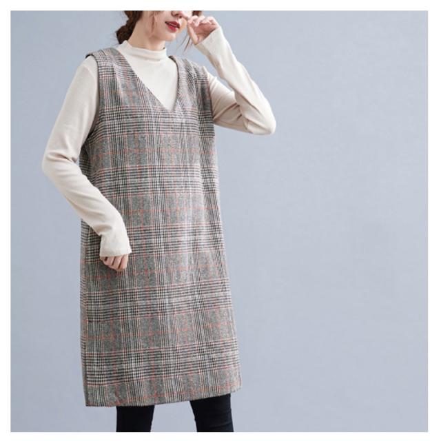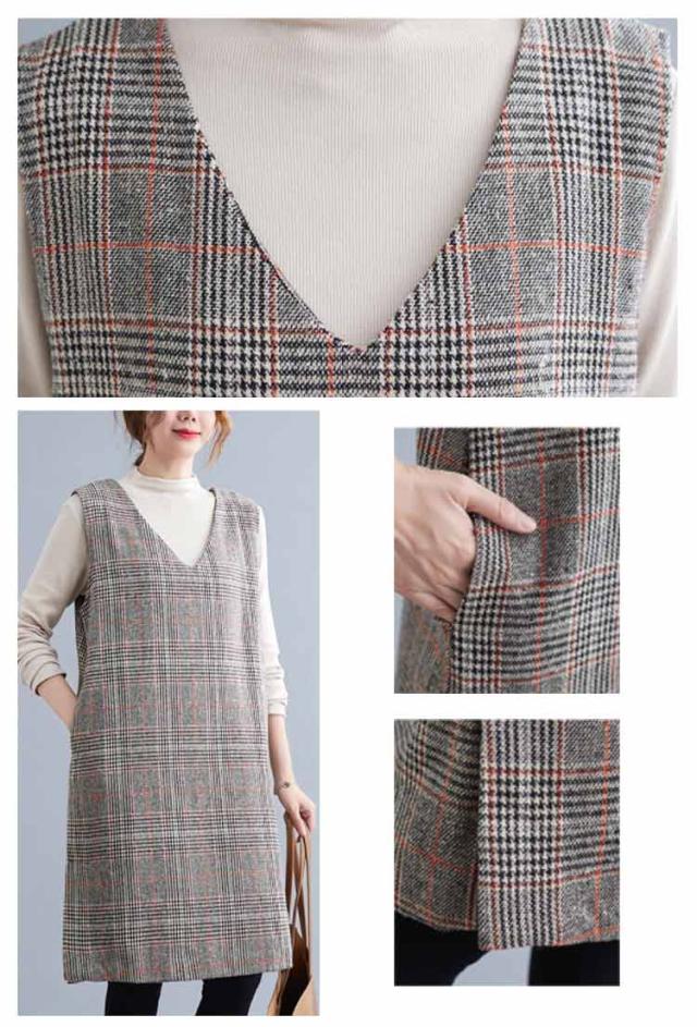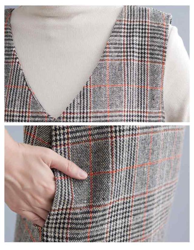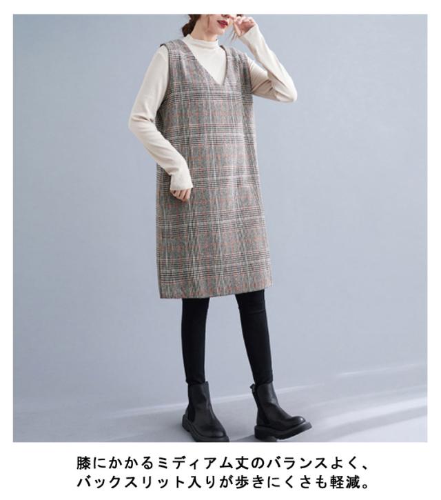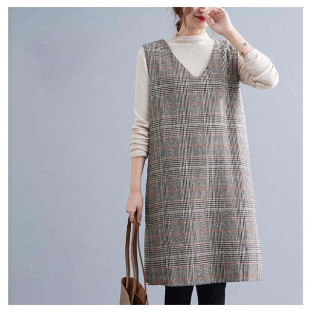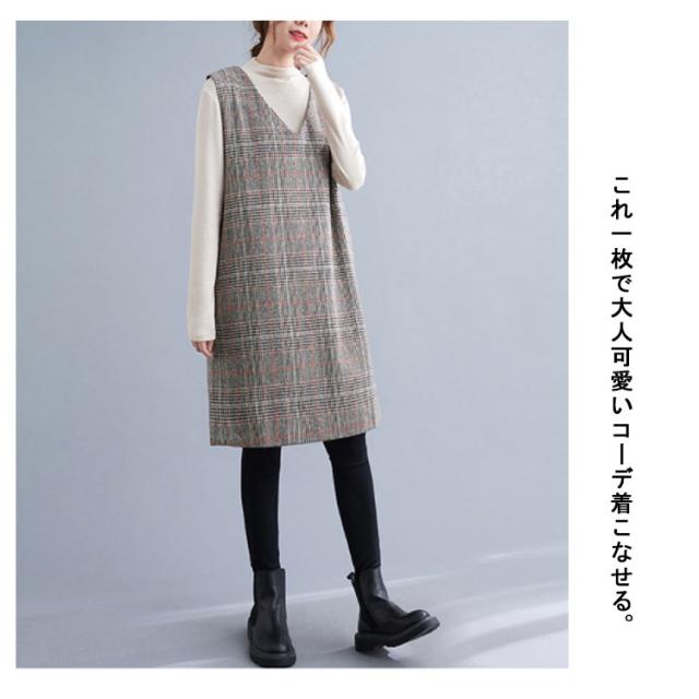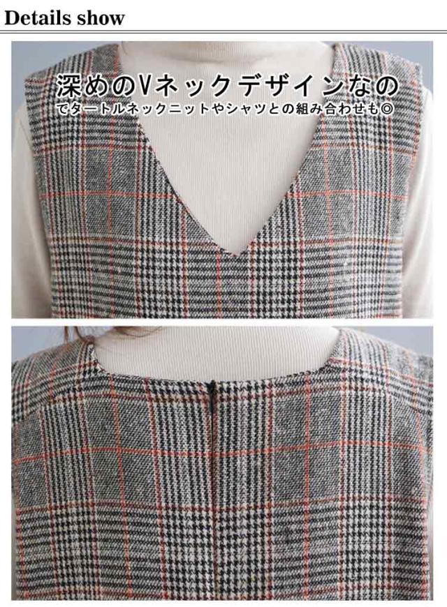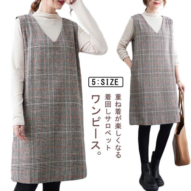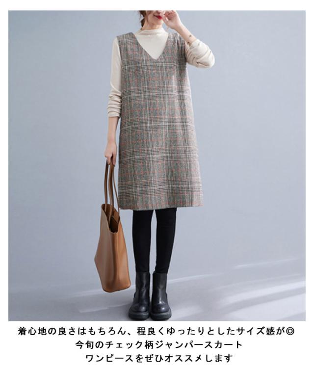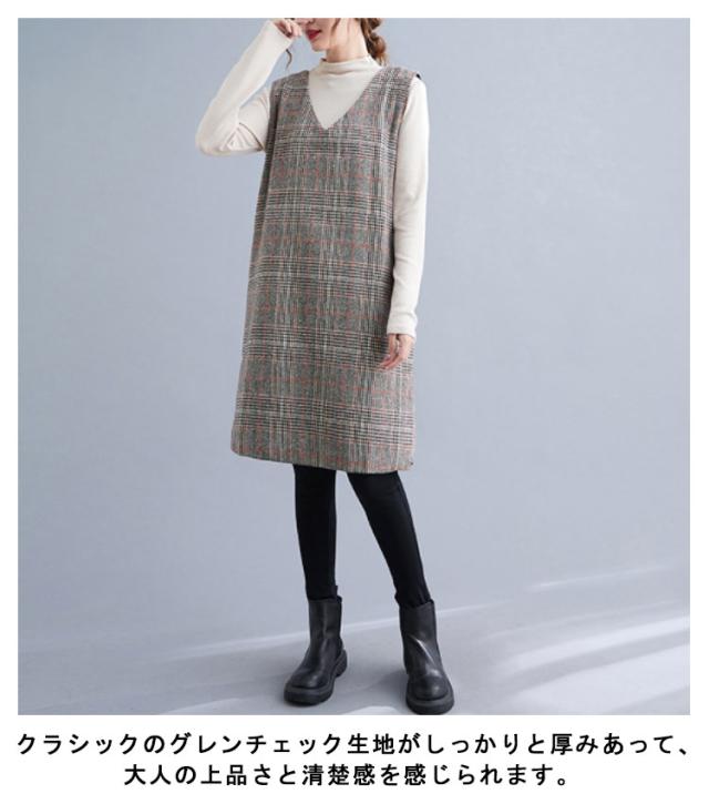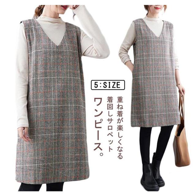 大人のこなれ秋冬スタイルに。グレンチェック ワンピース 秋 冬 ジャンパースカート サロペットワンピース Vネック ジャンパースカート 秋 冬 ノースリーブワンピース 重ね着 チェック柄ワンピース 可愛い おしゃれ レイヤード カジュアル 大きサイズ