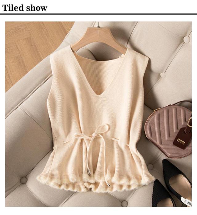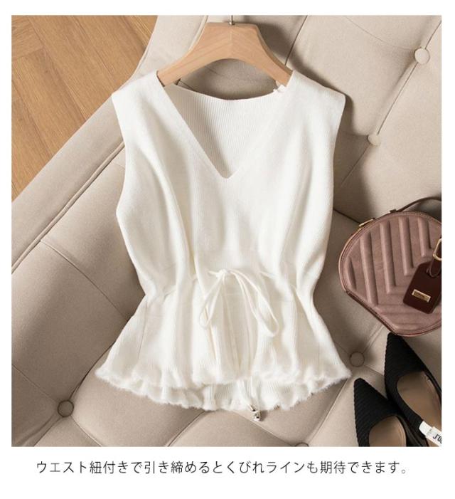 ウエスト紐付き ニットベスト レディース ノースリーブニット Vネック ニット ベスト 裾フリンジ ショート丈 チョッキ トップス プルオーバー シンプル 無地 春 秋 冬 送料無料