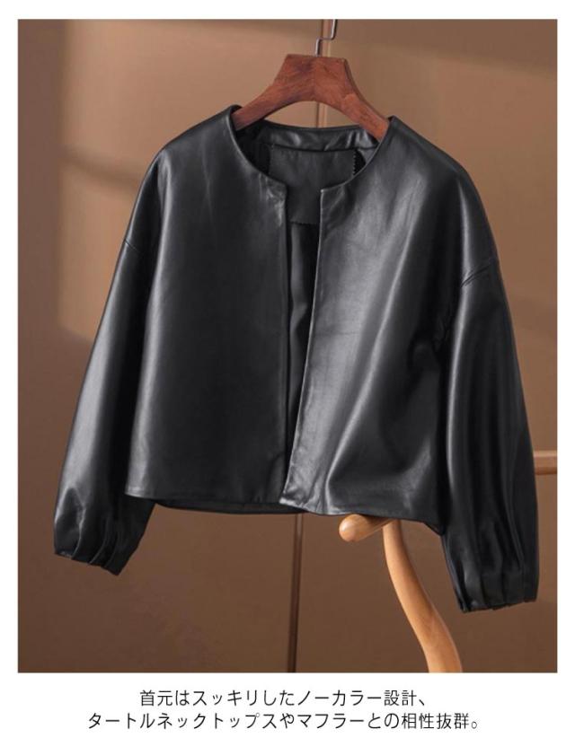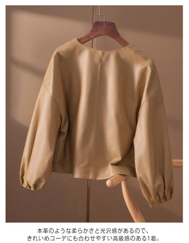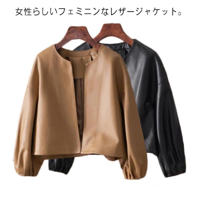 レザー ジャケット ノーカラージャケット レディース ショート丈 アウター バルーンスリーブ 合皮 ライダースジャケット キレイめ 革ジャケット 女性 20代30代40代