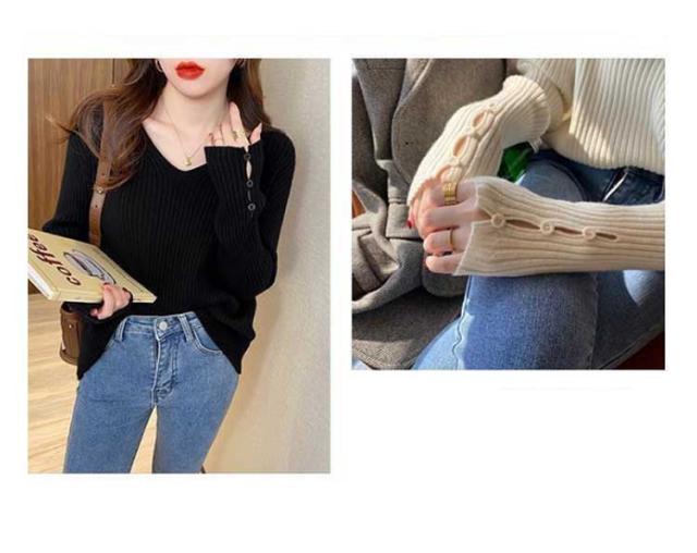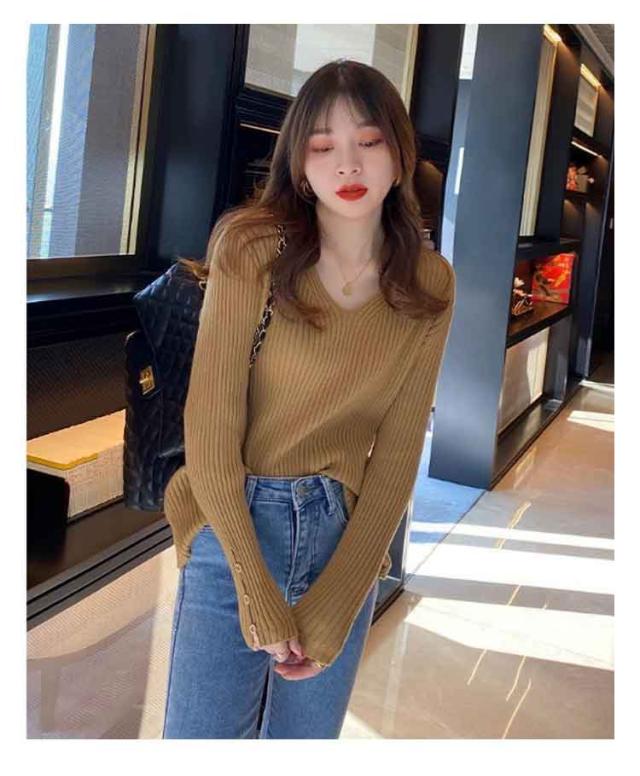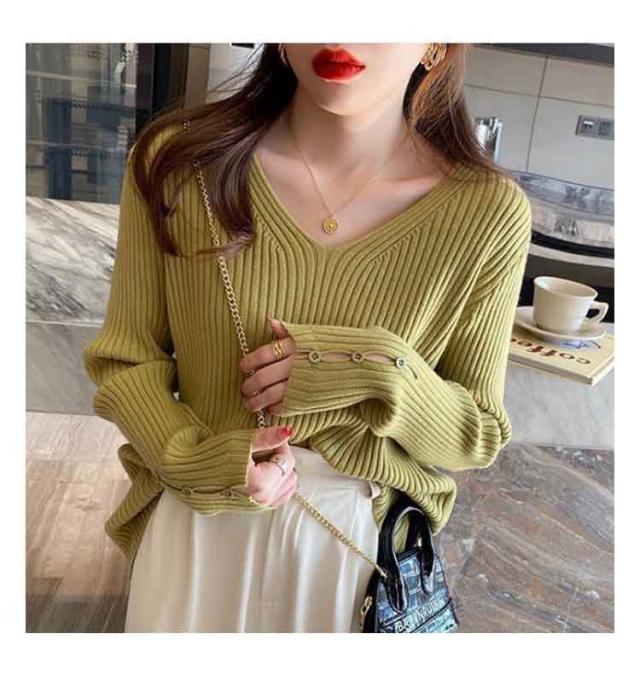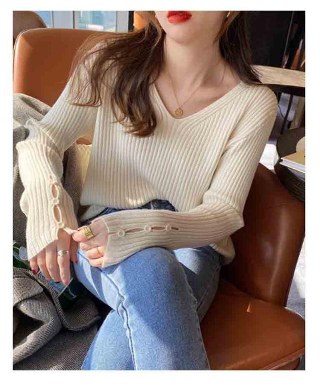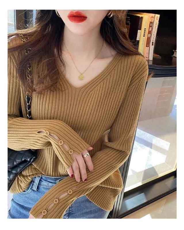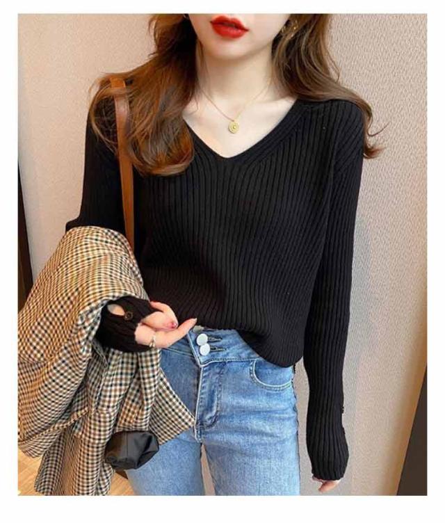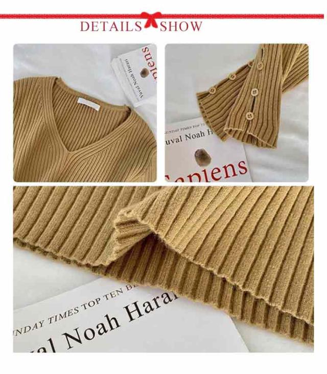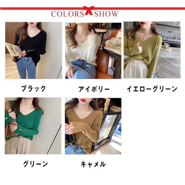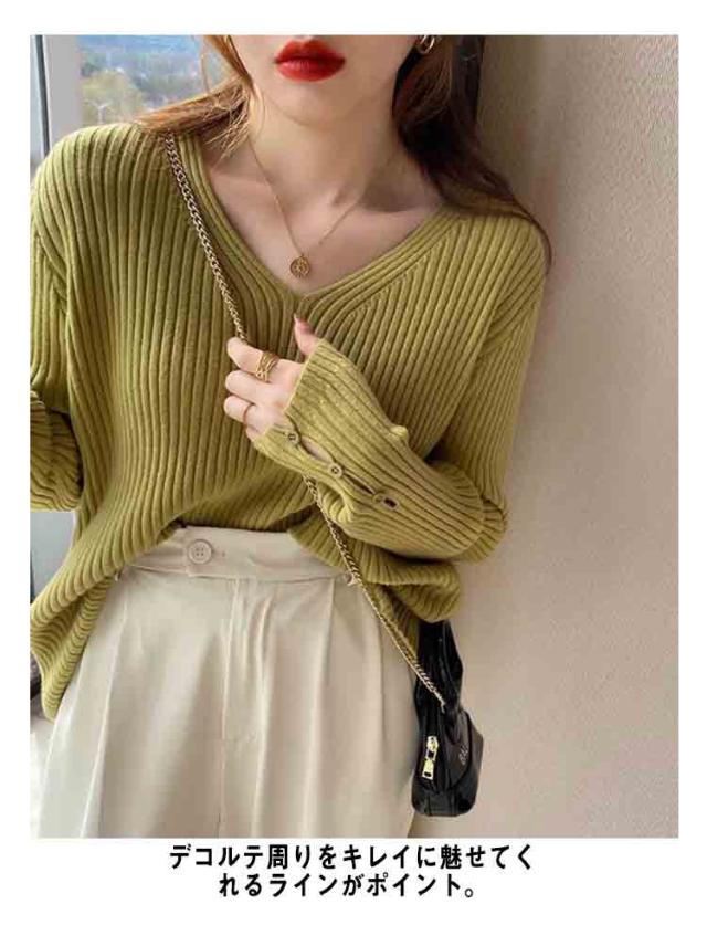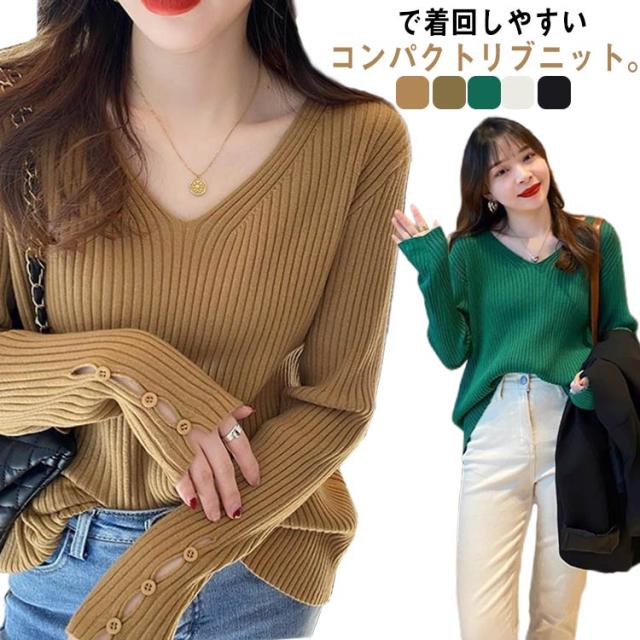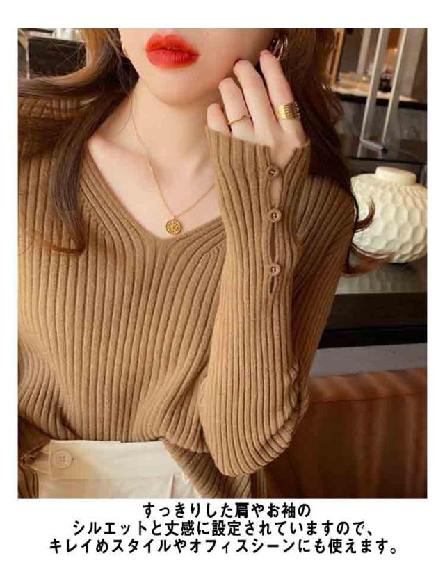 送料無料 リブニット カットソー レディース トップス セーター 長袖 Vネック リブ編み ストレッチ ボタンスリーブ 大きいサイズ プルオーバー 柔らか 伸縮性 フィット感 トップス ニット 大人 可愛い オフィス 通勤 通学
