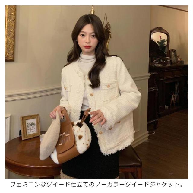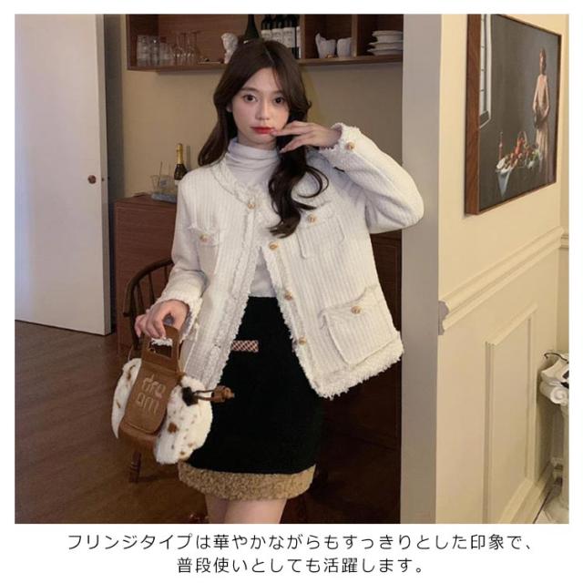| いつもの服装をほんの少しだけ華やかなものへ導きます。 フェミニンなツイード仕立てのノーカラーツイードジャケット。 華やかなフォーマルシーンからセレモニースタイルまで幅広く着用できます。 入学・入園・七五三などのママスタイルのコーディネートに大活躍。 フリンジタイプは華やかながらもすっきりとした印象で、普段使いとしても活躍します。 | |
