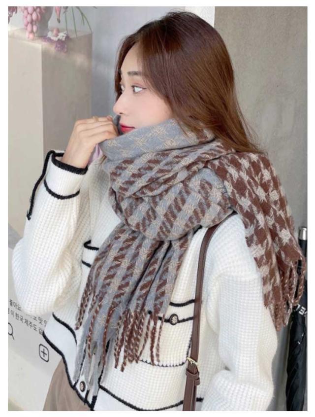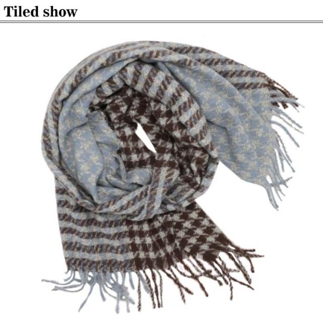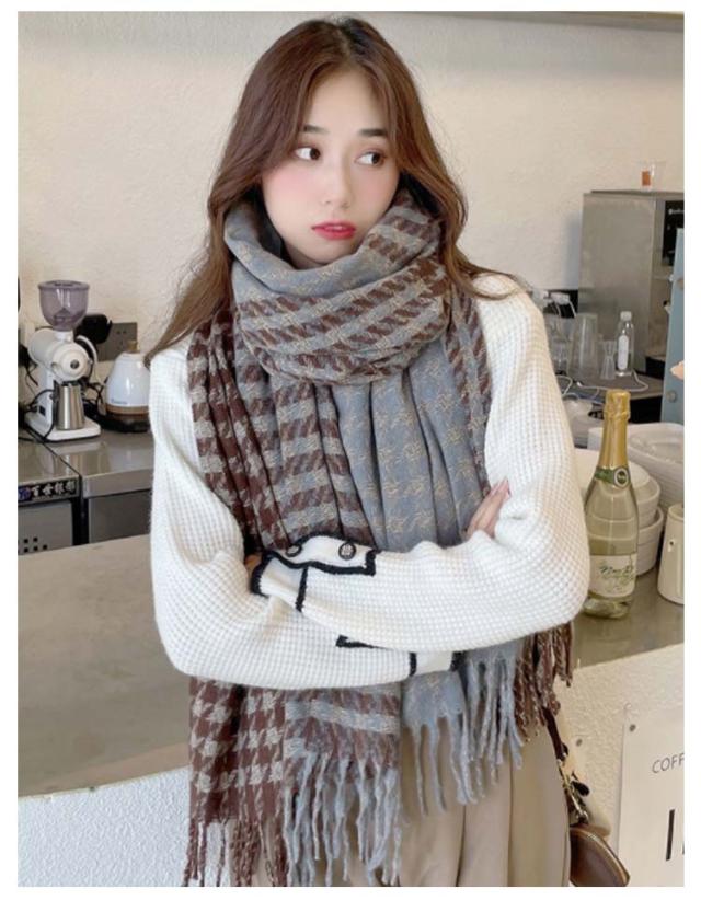 | 落ち着いた印象の千鳥柄大判マフラー。 お首回りにくるくる巻いて、小顔効果も期待できる! 巻いて使うのはもちろん、羽織ってもかわいい優秀アイテムです。 フリンジ使いのアクセントが上品な大人の着こなしを完成させてくれます。 チクチク感のない柔らかな肌触りでストレスなく身につけていただけます。 どんなコーデにも合わせやすいオシャレなデザイン。 | |