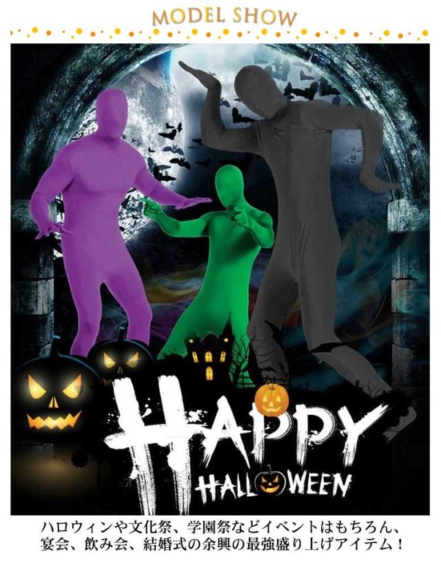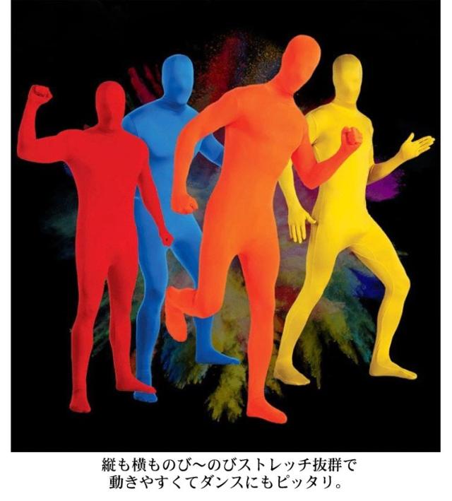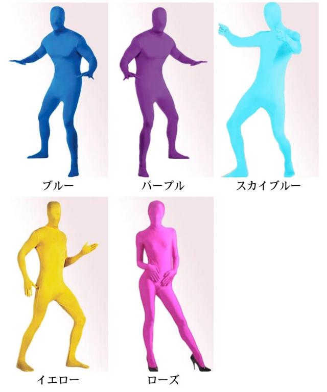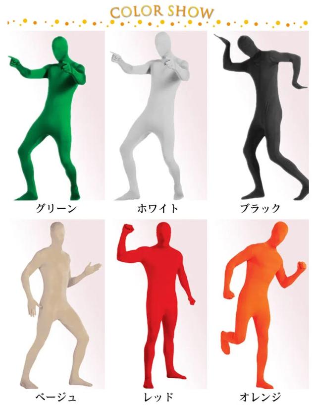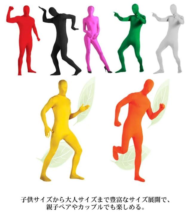 | 顔カバータイプの全身タイツ♪インスタ映え間違いなし! ハロウィンや文化祭、学園祭などイベントはもちろん、宴会、飲み会、結婚式の余興の最強盛り上げアイテム! 縦も横ものび〜のびストレッチ抜群で動きやすくてダンスにもピッタリ。 子供サイズから大人サイズまで豊富なサイズ展開で、親子ペアやカップルでも楽しめる。 | |