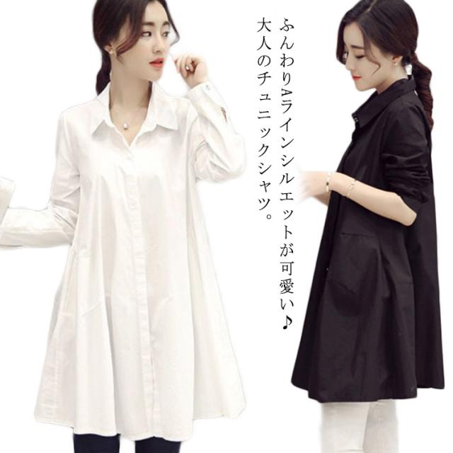 シャツワンピース チュニック 長袖 Aライン レディース フレア ワンピース 送料無料 体型カバー 着痩せ 韓国ファッション 通勤 ポケット付き 春秋 秋服 羽織 オフィス 黒 白