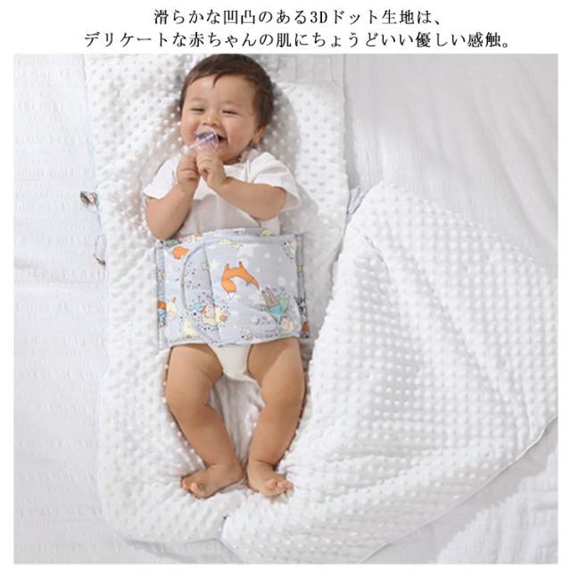 | ・ふかふか生地に包まれて、赤ちゃんぐっすり♪ベビー用スリーピングバッグ。 ・ユニークな寝袋スタイルのポケットにすっぽりと入ったら、すやすや快適なスリーピングタイム。 ・表生地にコットン素材、中生地にレーヨン、内側に柔らかな3Dドット生地を組み合わせた3層構造で、保温性・通気性もばっちり。 ・滑らかな凹凸のある3Dドット生地は、デリケートな赤ちゃんの肌にちょうどいい優しい感触。 ・寝袋ポケット内側の面ファスナーベルトが睡眠中の赤ちゃんの姿勢を程よくキープ。活発な赤ちゃんの寝返りやモロー反射のような突然の身体の動きも優しくホールドしてくれるので安心。 ・赤ちゃんが寝返りを打つたびに布団をかけ直す必要がなく、パパ・ママもゆっくり眠れるお助けアイテムです。 ・Wファスナー設計。全部開放できるのでおむつ替え時や、ベッドへの移動時などにも大変便利です。 ・開口部のフラップ両端を面ファスナーで貼り合わせればフード状になるので、頭もあったか快適。 ・忙しいママさんに嬉しい、洗濯機での丸洗いOK!いつでも清潔に使えてお手入れも楽ちん。 ・お昼寝用のお布団としてはもちろん、抱っこ用のおくるみとしても使える。 ・なかなかないアイテムなのでプレゼントに喜ばれます♪ | |