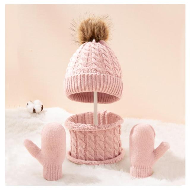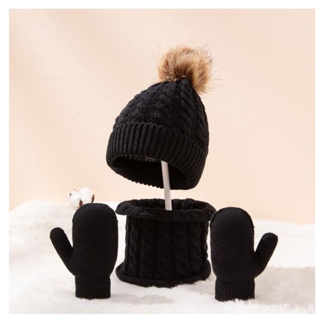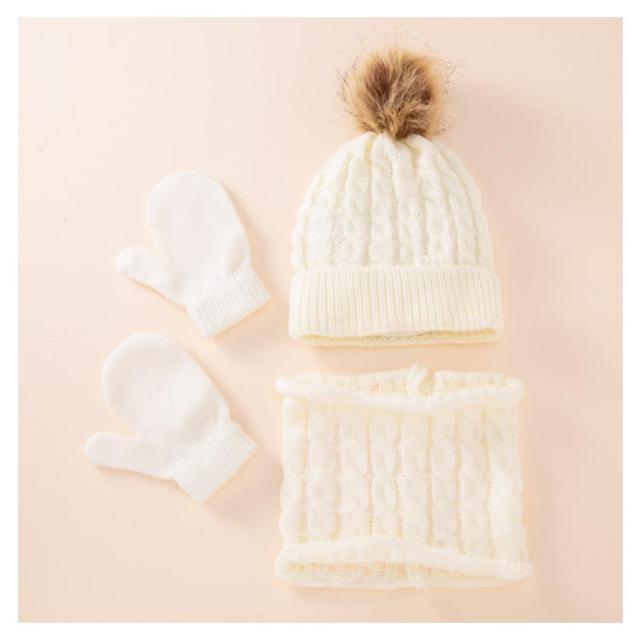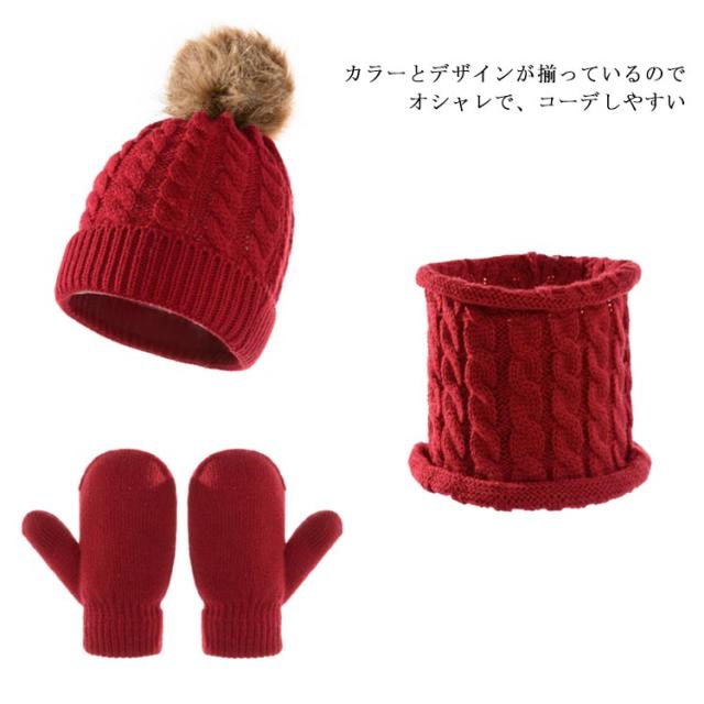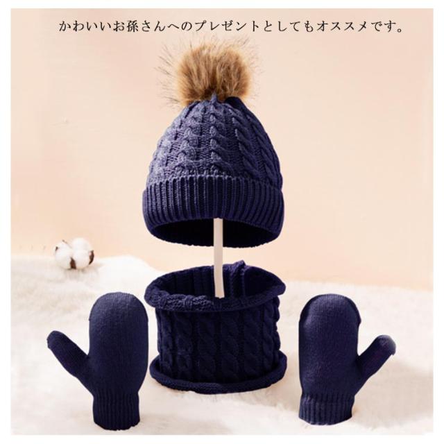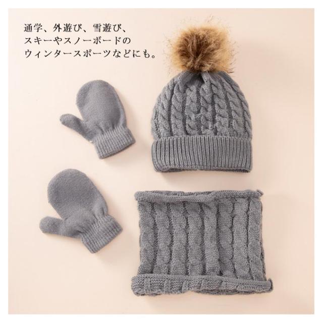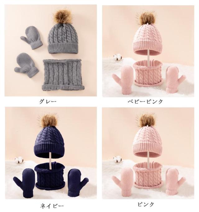 子供 ベビー ニット帽 手袋 ネックウォーマー 3点セット 男の子 女の子 ポンポン付き ニットキャップ 防寒帽子 スキー スノボ 自転車 お揃い 無地 全8色
