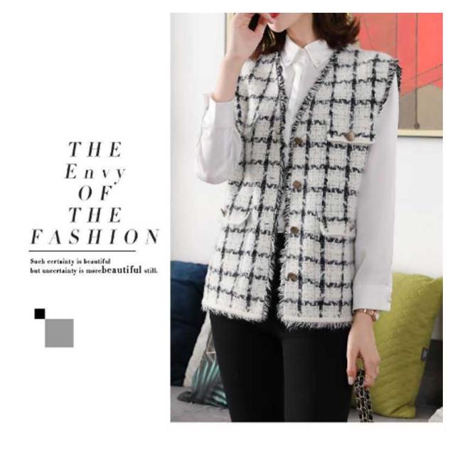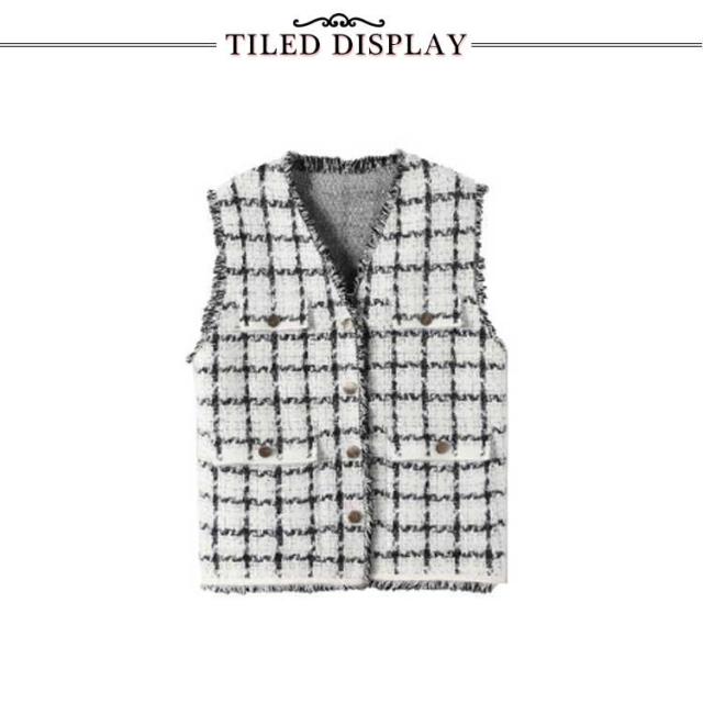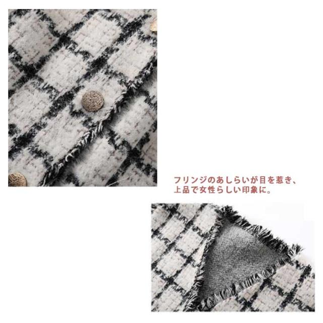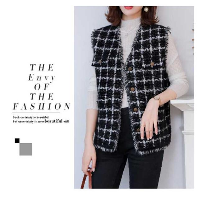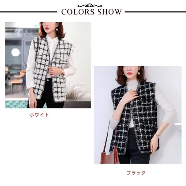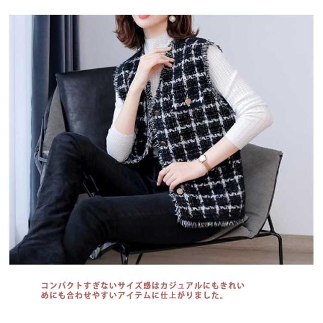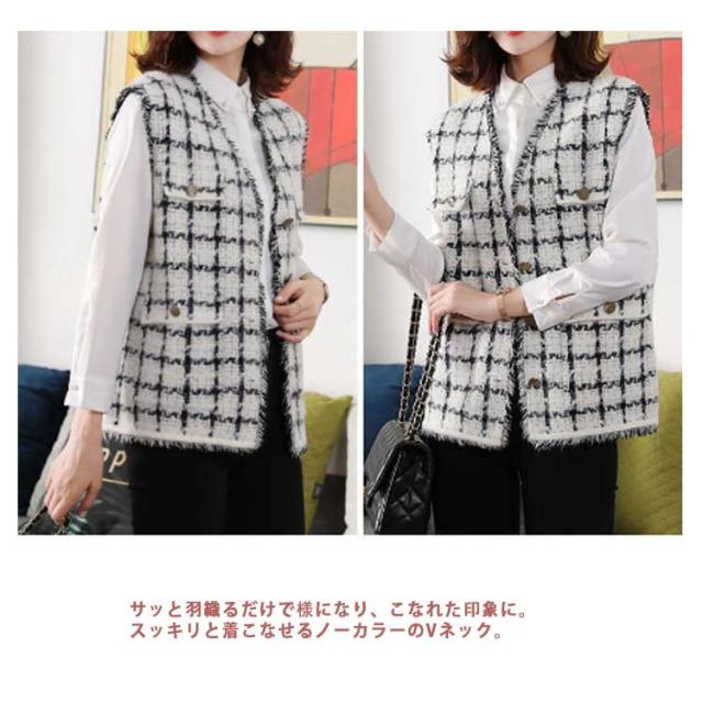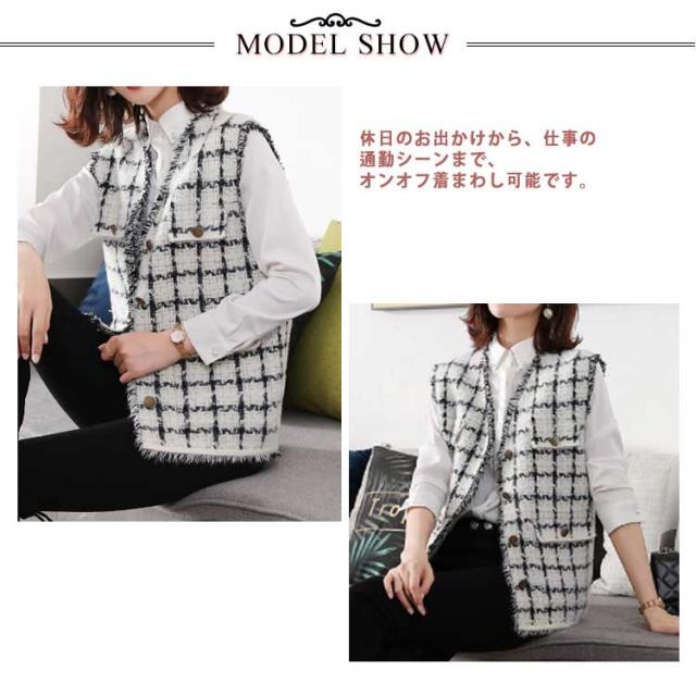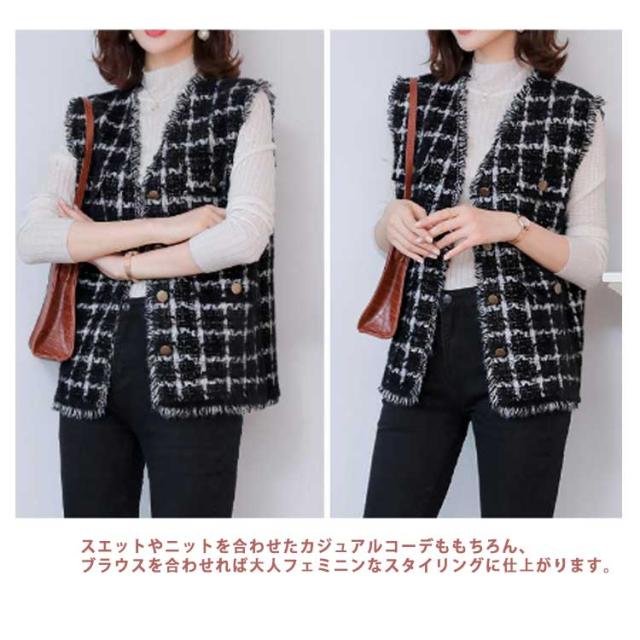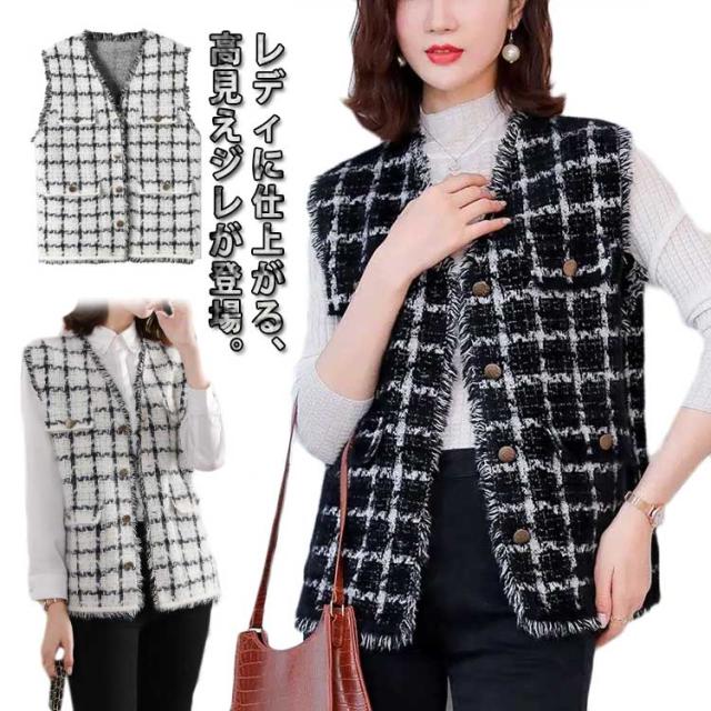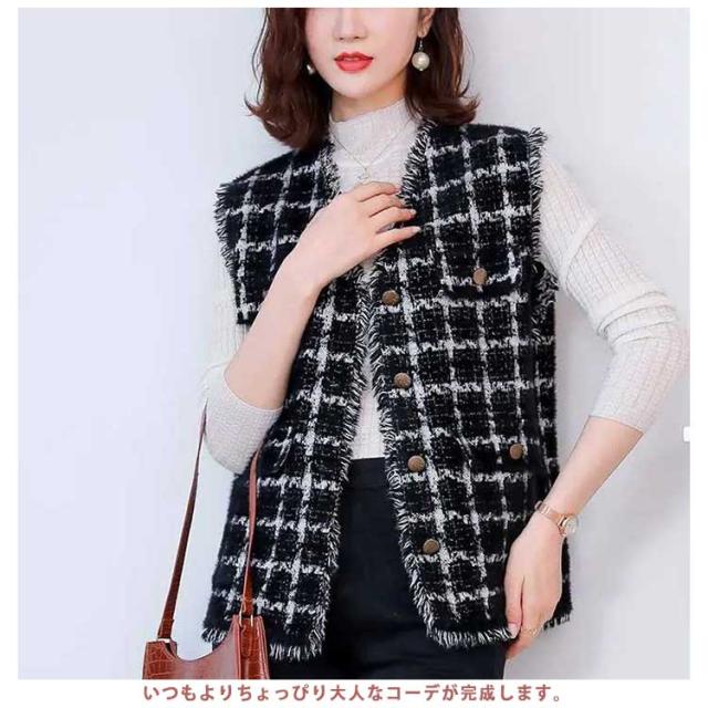 ベスト ジレ レディース Vネック アウター ジャケット チェック柄 フリンジ 前開き 袖なし ノースリーブ フェイクミンクフリース素材 羽織り おしゃれ きれいめ 上品 入園入学 卒業式 秋 冬 全2色
