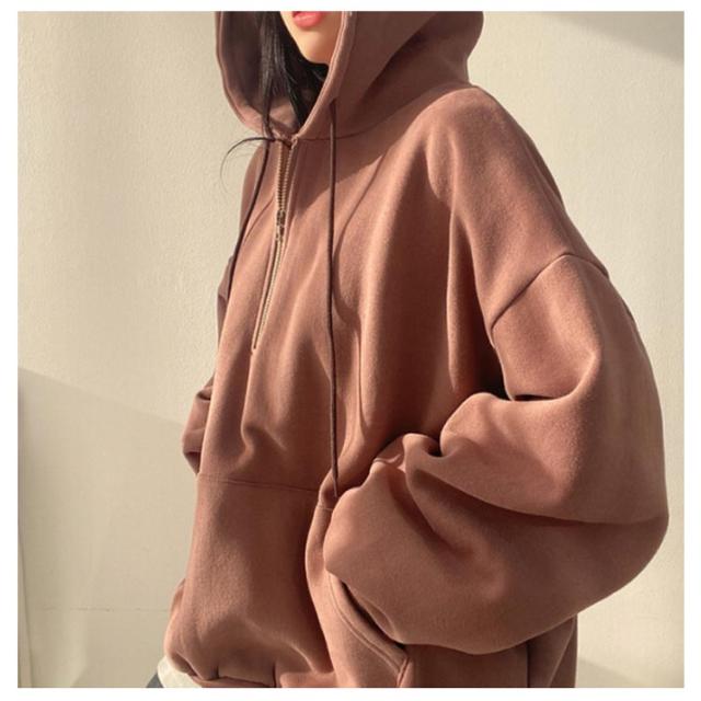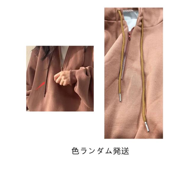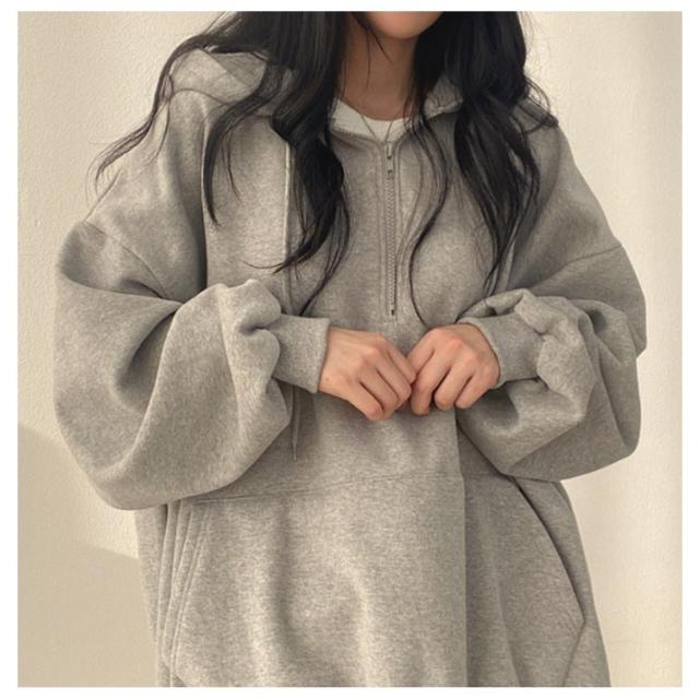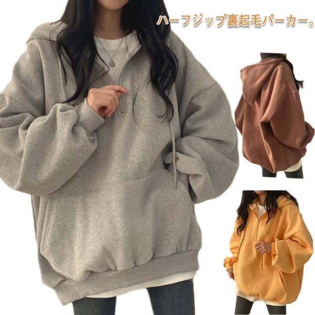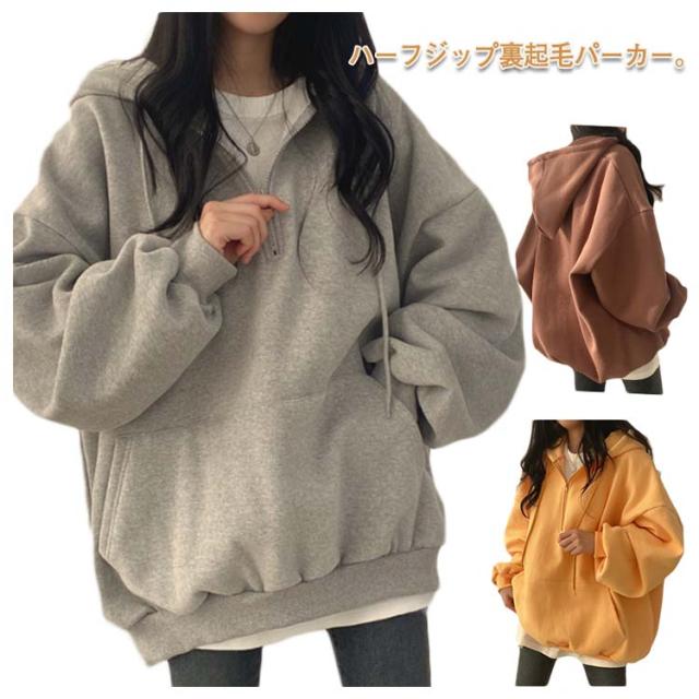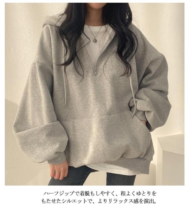 パーカー レディース ハーフジップ 裏起毛パーカー 長袖 トップス ボリュームスリーブ スウェット フード付き 無地 裏起毛 防寒 あったか 韓国ファッション ゆったり 体型カバー オーバーサイズ 薄手 プルオーバー 秋冬 春 コットン 通学 通勤 送料無料