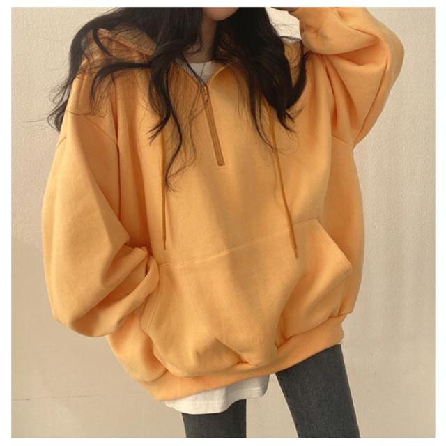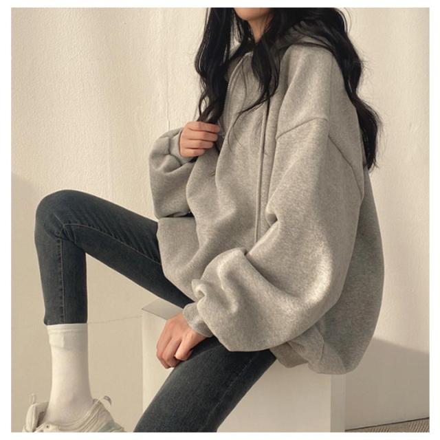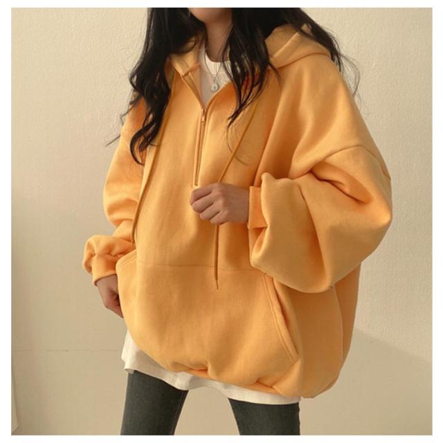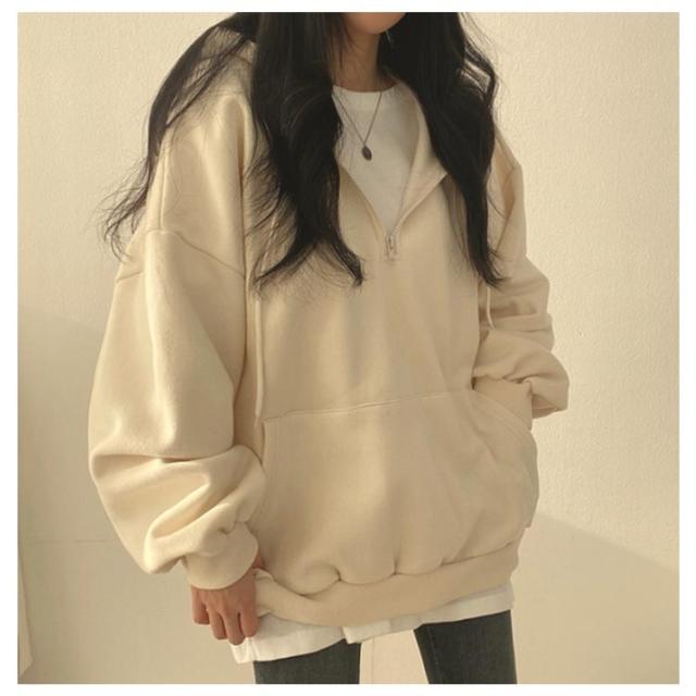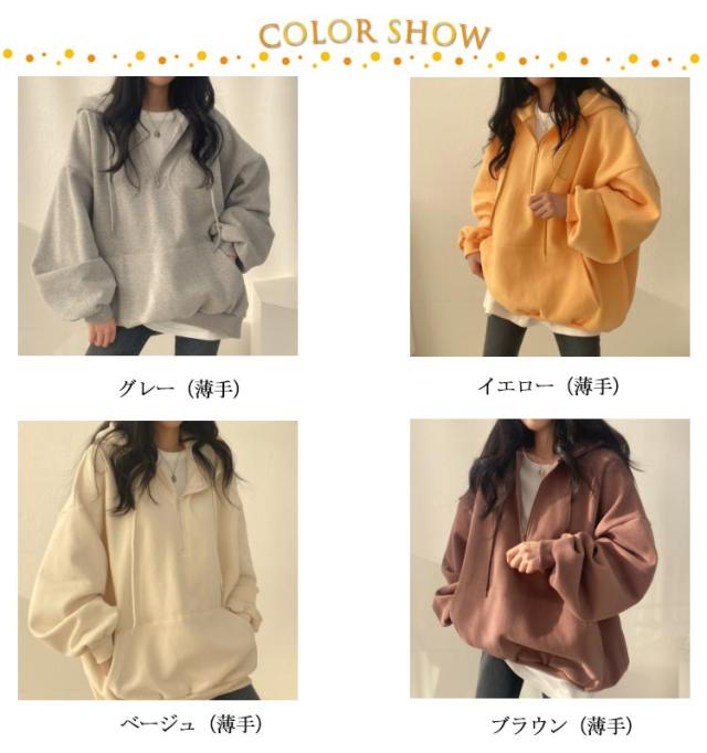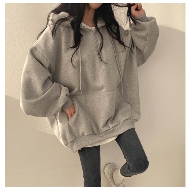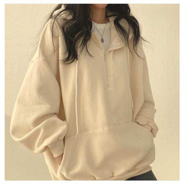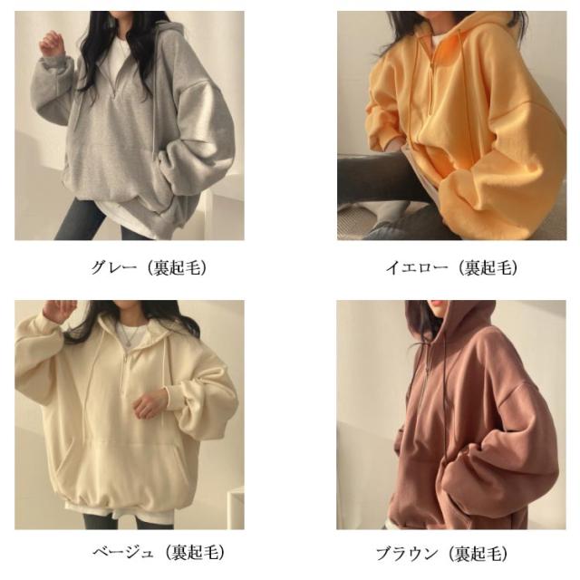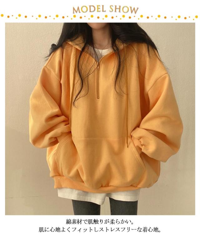 | ハーフジップ裏起毛パーカー。 綿素材で肌触りが柔らかい。肌に心地よくフィットしストレスフリーな着心地。 ハーフジップで着脱もしやすく、程よくゆとりをもたせたシルエットで、よりリラックス感を演出。 ジップフードによる小顔効果抜群、着こなしを自由に楽しめます。 オーバーシルエットとボリュームスリーブで、体型カバーにも優れています。 | |