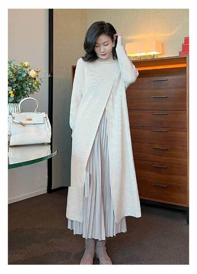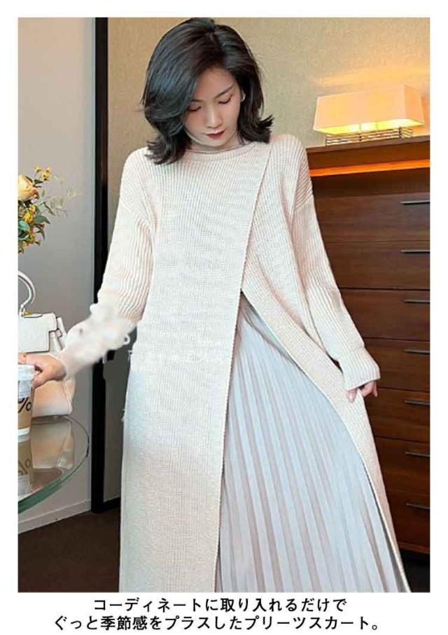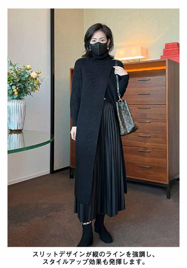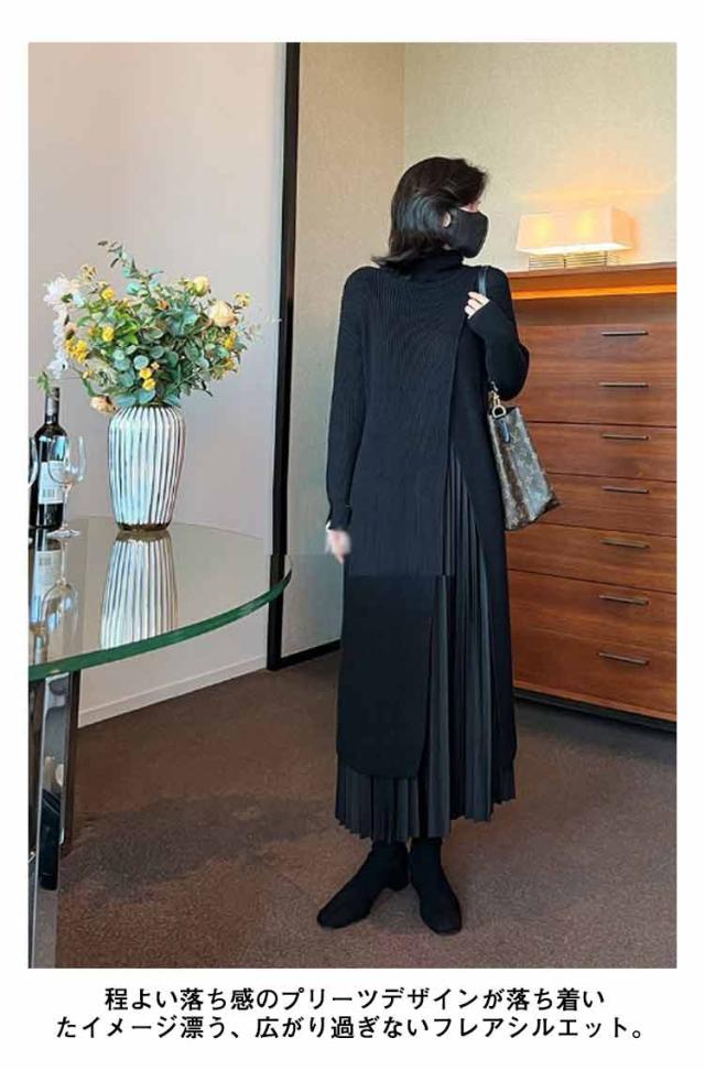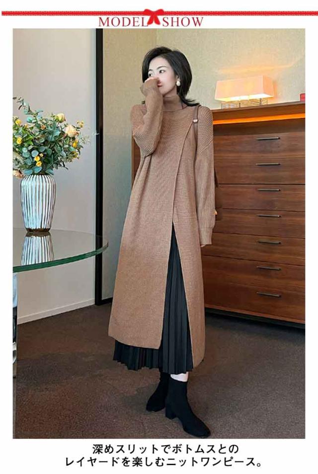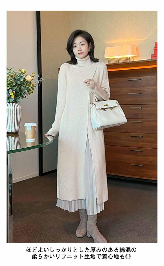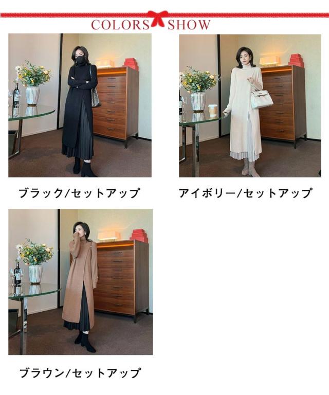 ニットワンピース プリーツスカート セットアップ スリットワンピース ロングスカート サイドスリット タートルネック ハイネック ロング丈 レイヤード 重ね着 ペチコート ペチスカート プリーツ 大きいサイズ 体型カバー