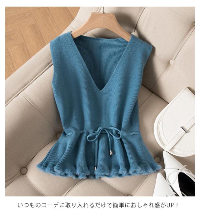 ウエスト紐付き ニットベスト レディース ノースリーブニット Vネック ニット ベスト 裾フリンジ ショート丈 チョッキ トップス プルオーバー シンプル 無地 春 秋 冬 送料無料