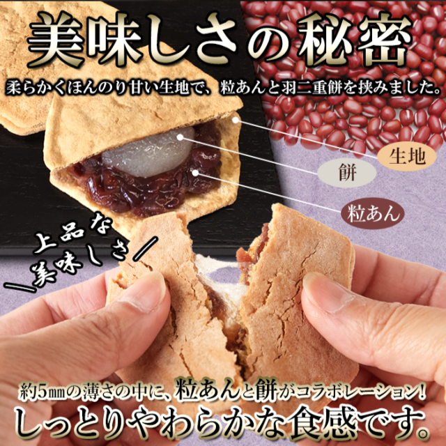 柔らかくほんのり甘い生地で、粒あんと羽二重餅を挟みました。