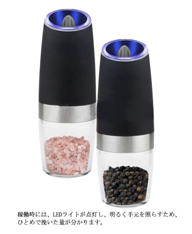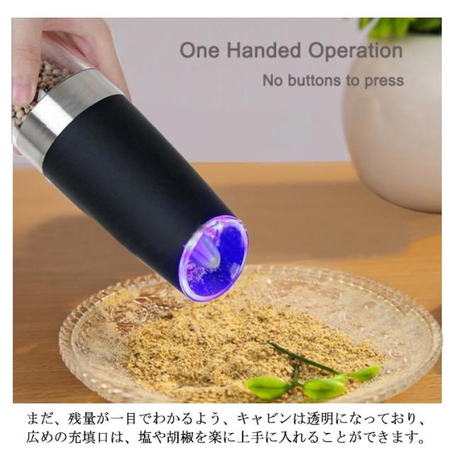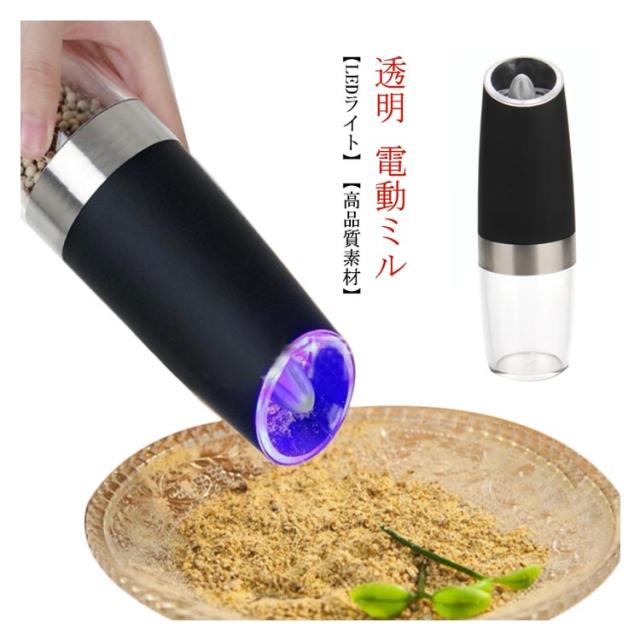 送料無料 電動ペッパーミル 電動ミル 重力センサー ペッパーミル 傾けるだけで挽ける コショウ 岩塩 香辛料 スパイスミル 粗さ調節可能 ライト付き 片手でラクラク操作できる 料理器具 片手 ソルト 塩 胡椒 透明 ペッパー スパイス 粗挽き