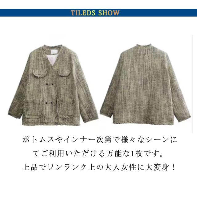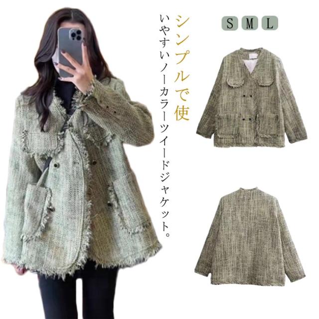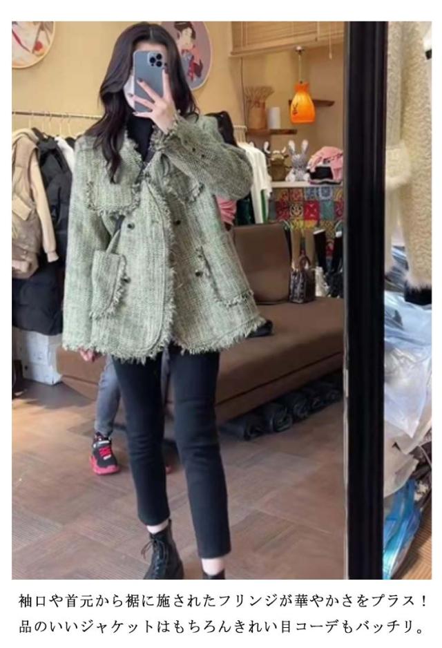 ツイードジャケット ノーカラー フリンジ レディース ジャケット ツイード アウター スーツジャケット フォーマル カジュアル 卒業式 入学式 スーツ ママ 大人 高級感 オフィスカジュアル アウター グリーン チェック