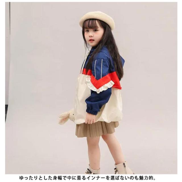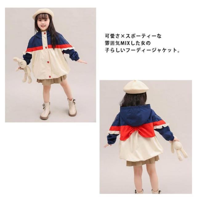 ジャケット キッズ ブルゾン マウンテンパーカー 女の子 110-160cm ウインドブレーカー 子供服 コート 薄手 防風 フリル 配色 フード付き 春秋 アウター ジュニア 可愛い 110cm 120cm 130cm 140cm 150cm 160cm