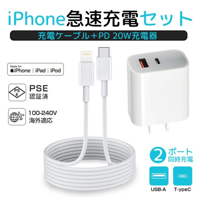 Lightning充電セット 20W PDアダプター 2ポート+ Lightning ケーブル 2点セット 急速充電 データ転送 PSE認証 iPhone14 iPhone13 ライトニング 充電コード 充電器 ライトニング ケーブル